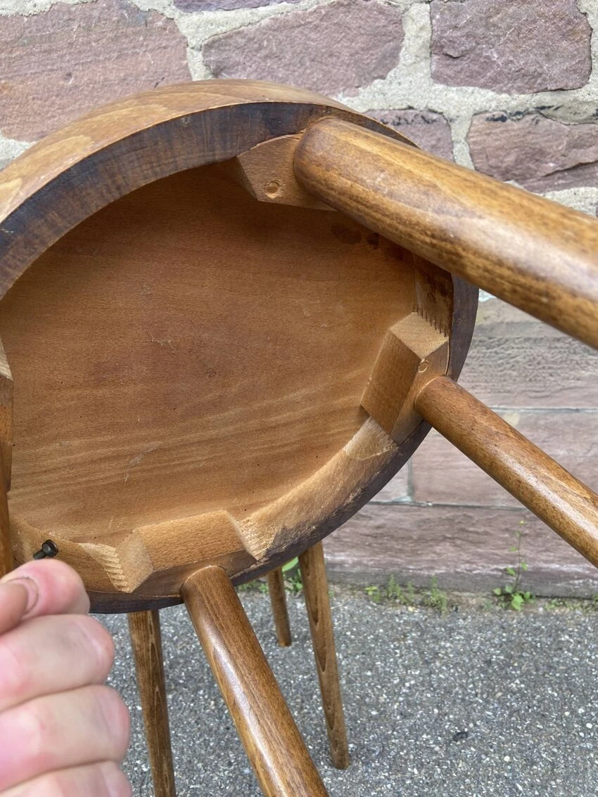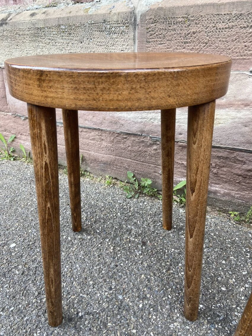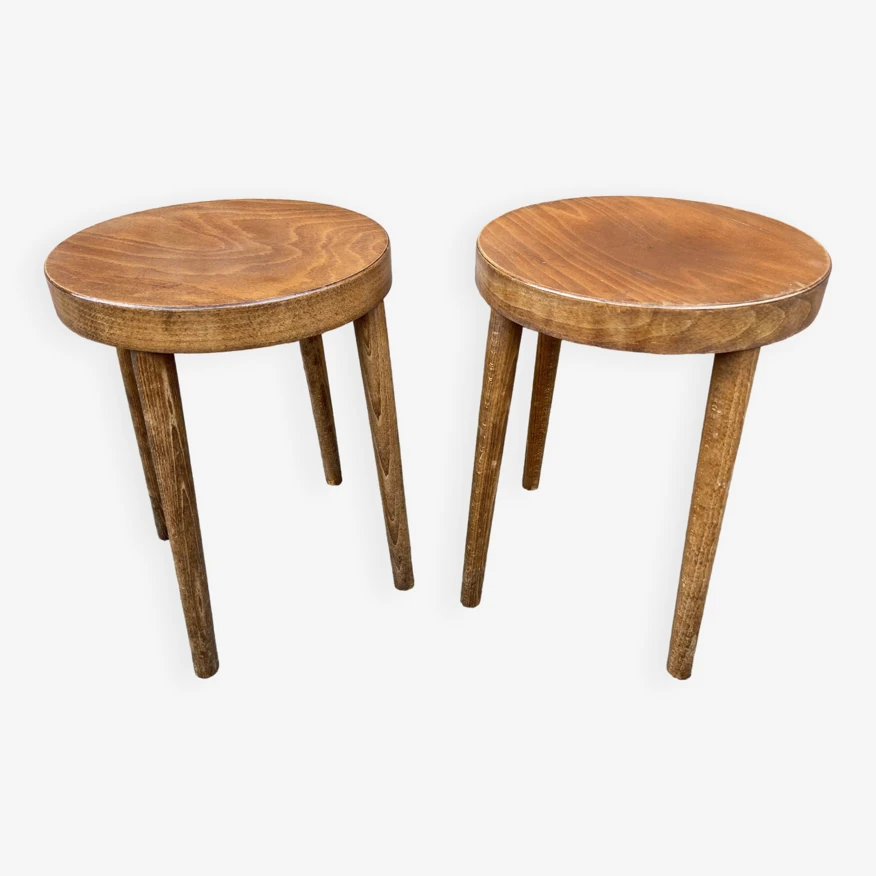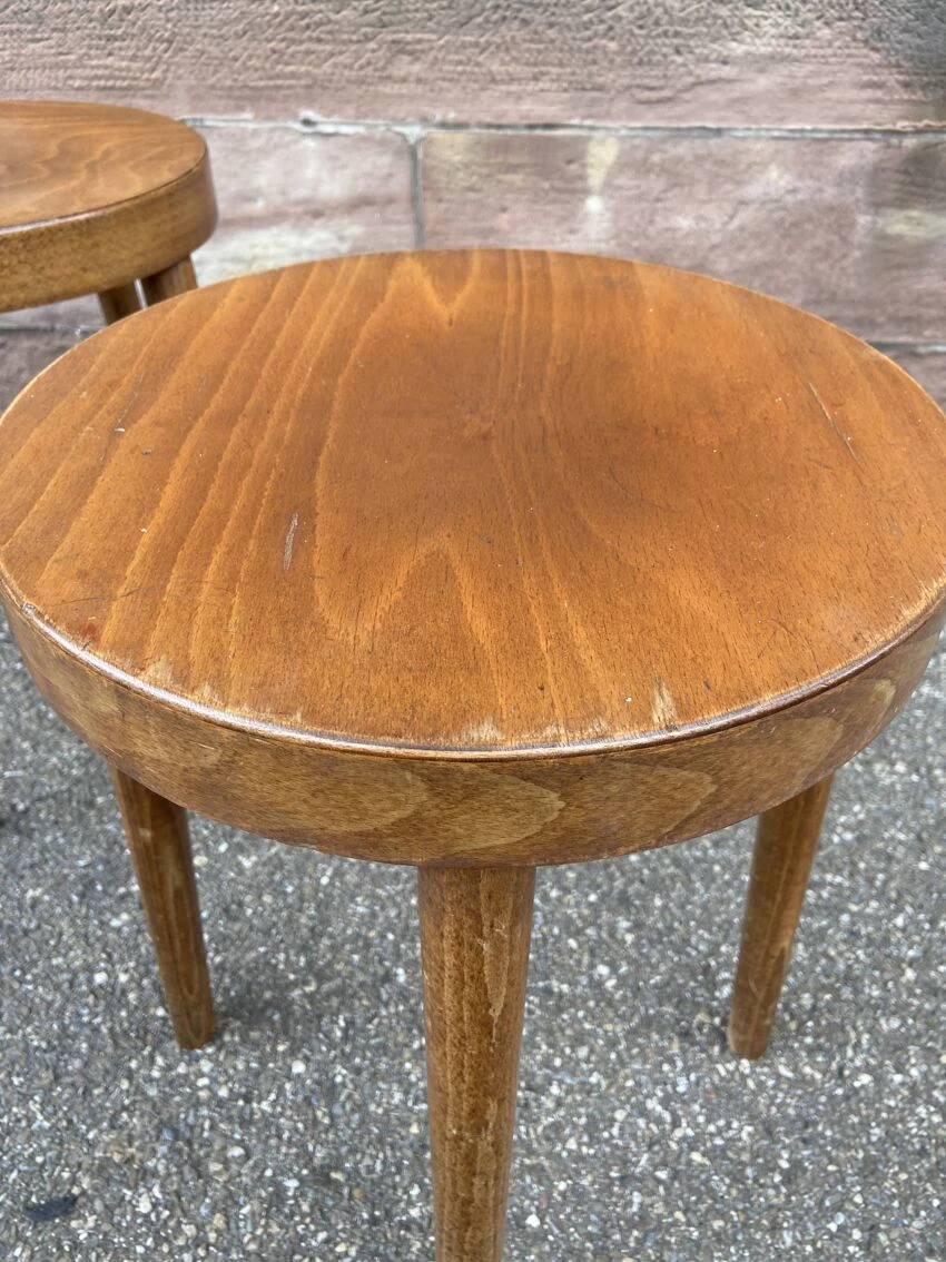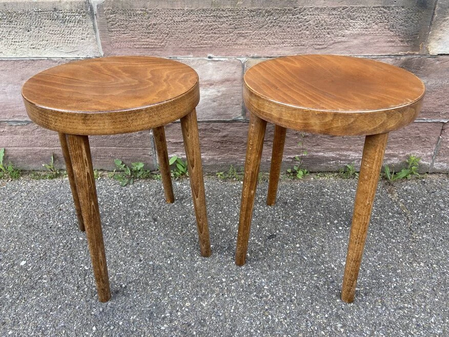 Price for 2 unstamped beech wood stools from the 70s/80s – good condition with some traces of use, seat diameter 34 cm – height 46 cm.