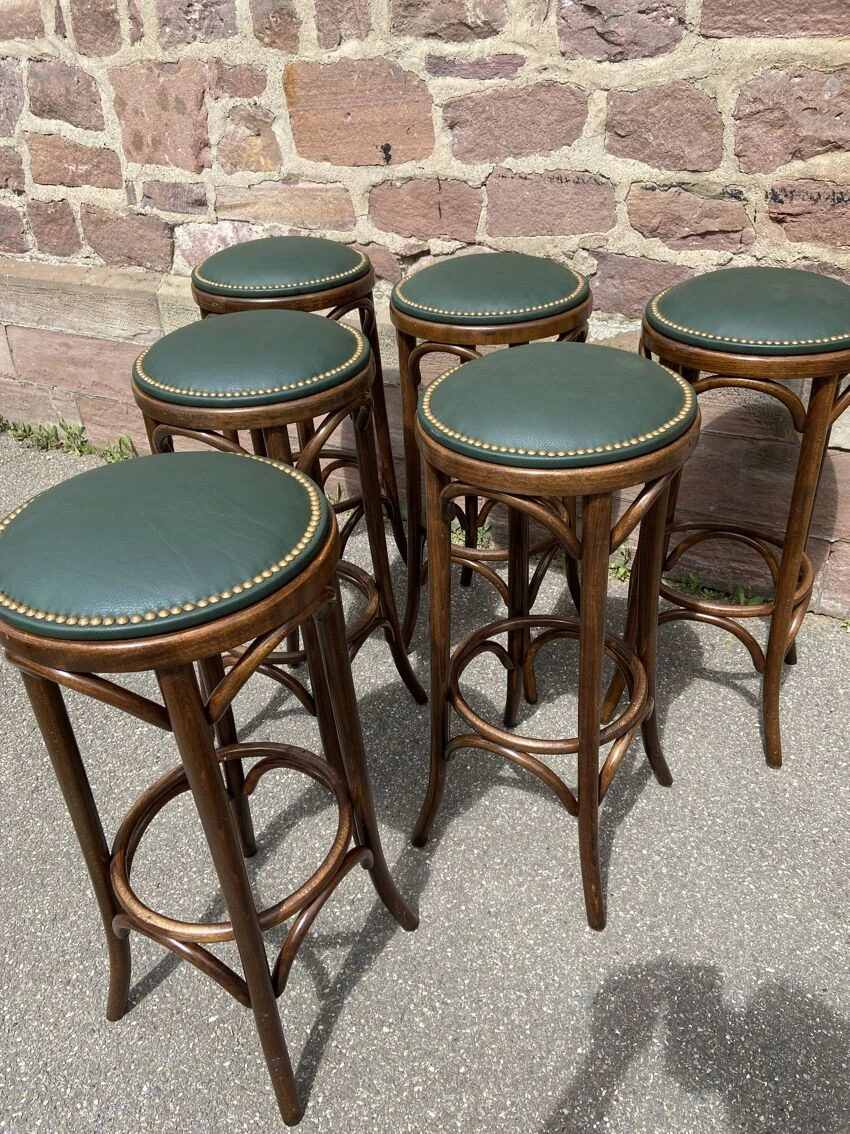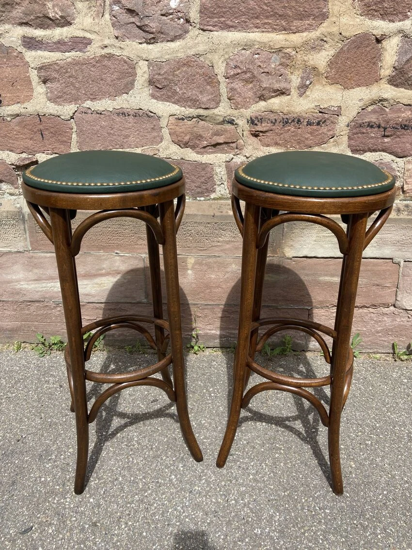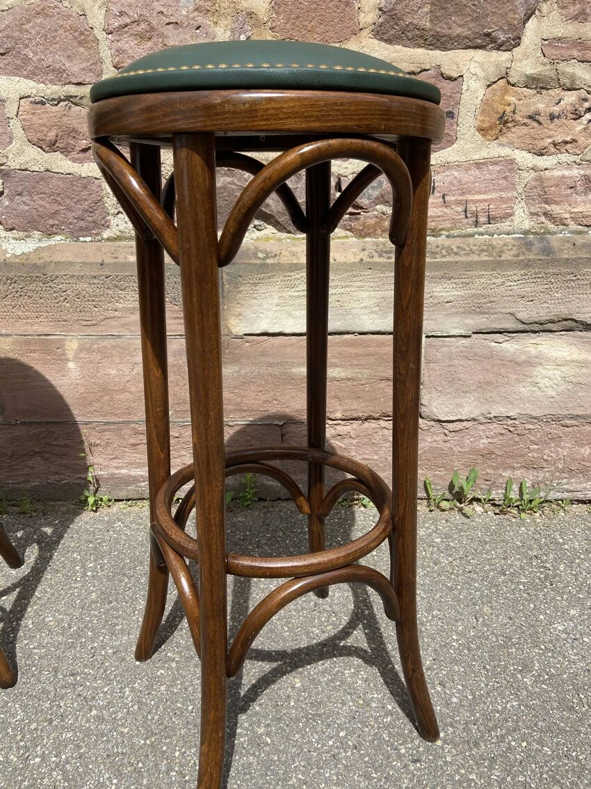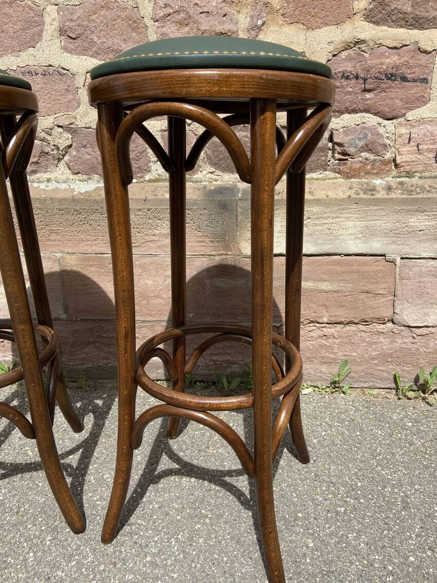 No stamp – structure and frame in bent beech wood – patina with wear over time, the stools are very solid the stools have a very beautiful patina height: 82 cm.