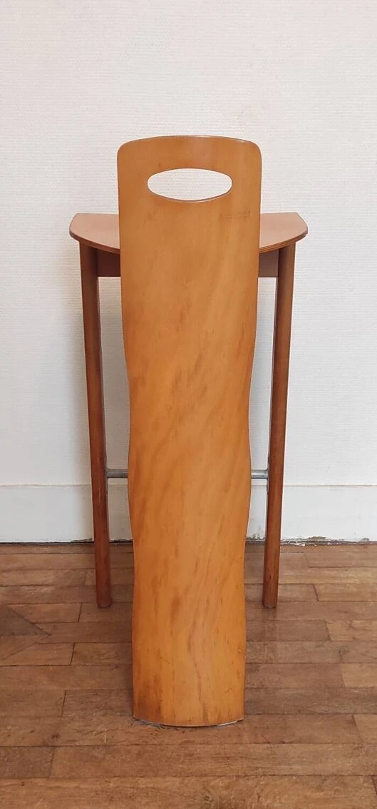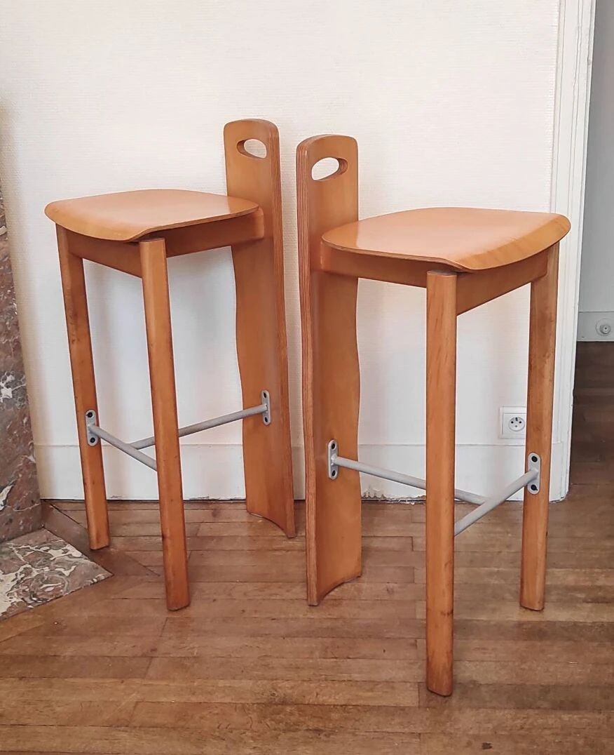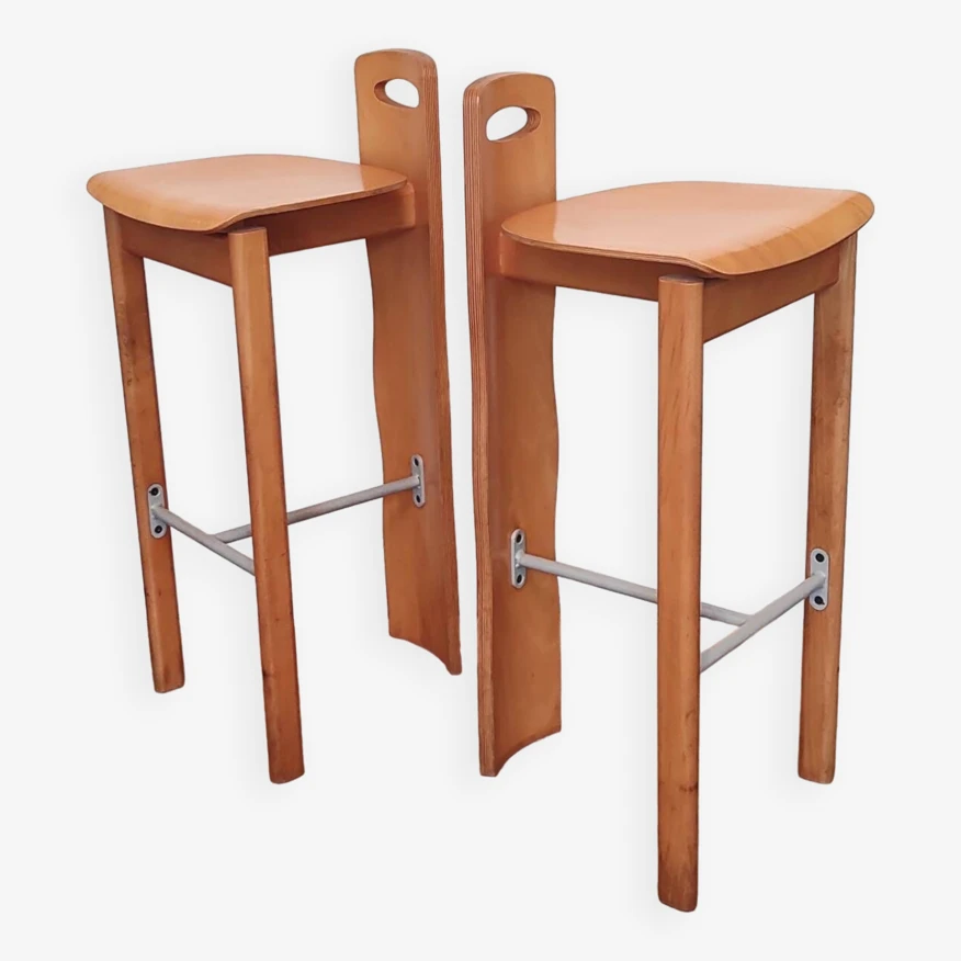 So design! Pair of high bar stools in solid wood (beech) and gray metal. Geometric and minimalist design inspired by the Memphis movement. Good quality of manufacturing and finishing. Good condition. Traces of use. Height: 93 cm seat: 79 cm. Width: 39 cm. Depth: 42 cm. Weight: 7 kg.