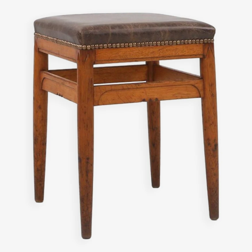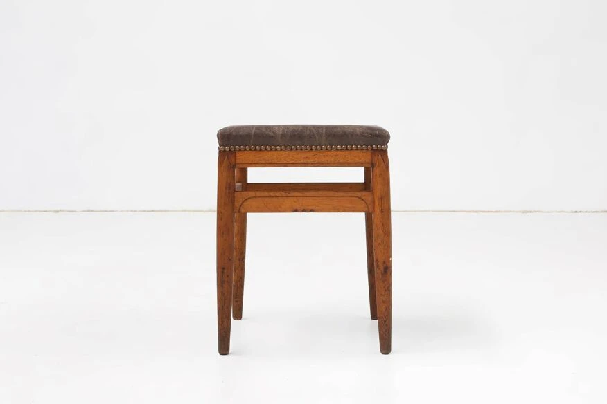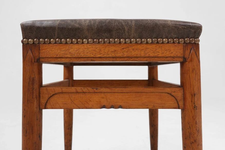 An art deco stool with tapered square section legs, elegant graving and leather top with decorative nailing.