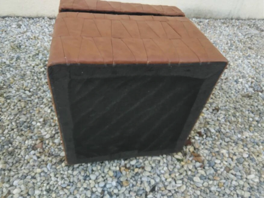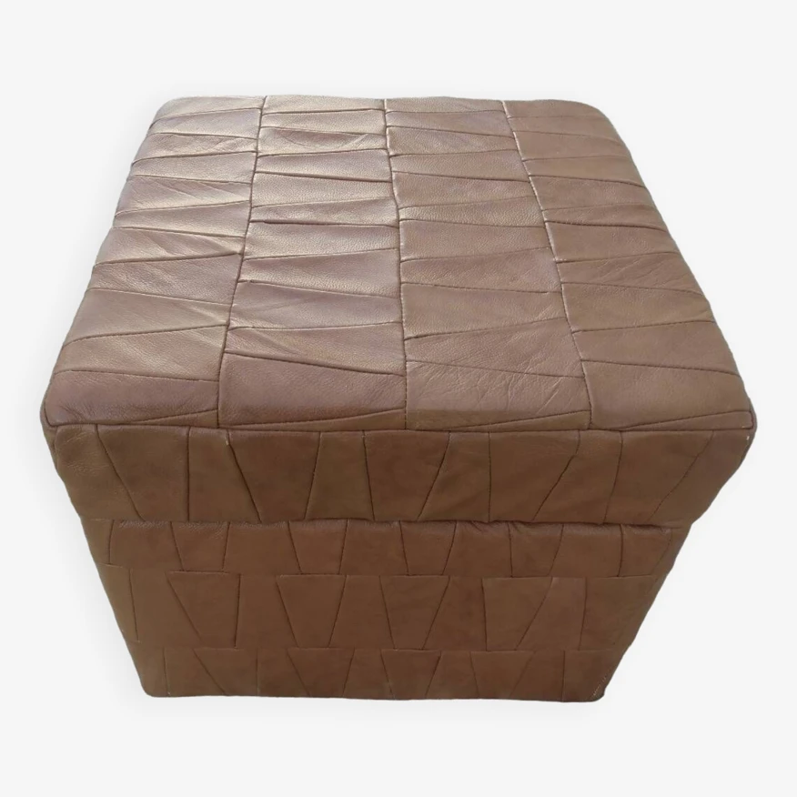 Chest stool with wooden structure and fawn patchwork leather covering 1970.