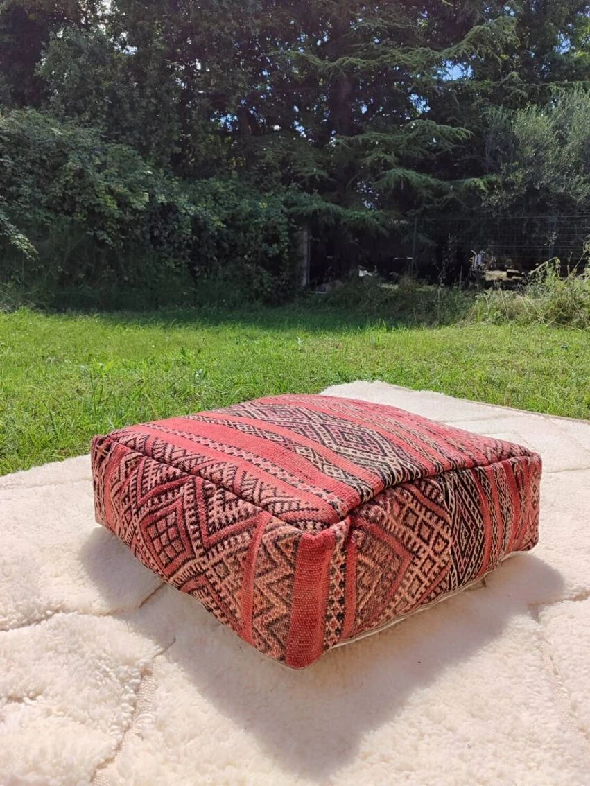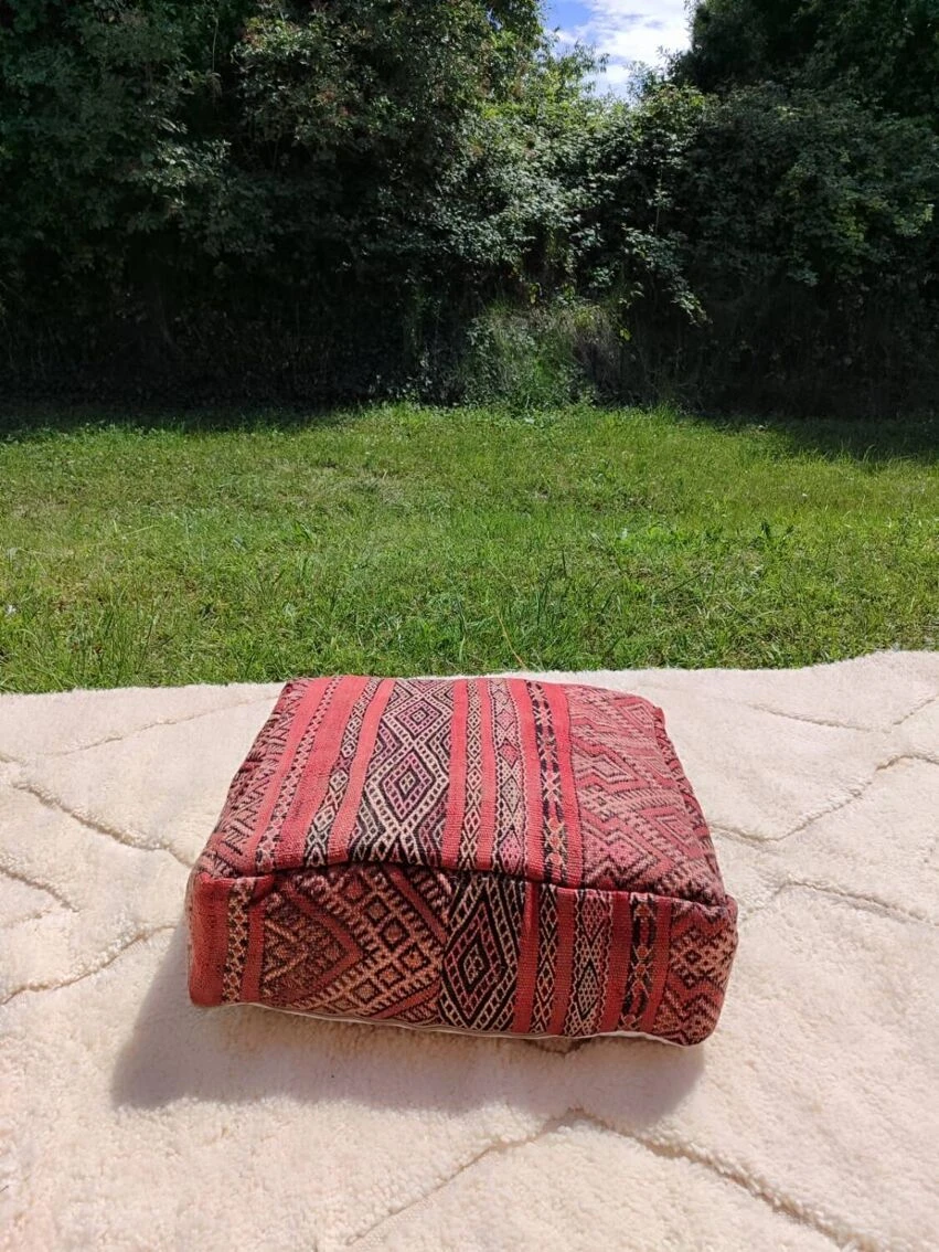 Berber pouf in natural wool (wool on wool) 100% handmade (unique piece) Ideal #original gift (fun yoga or boho) Fast and careful shipping Dimensions: 60*60*20 cm. Brand new, unpadded item. Kilim wool pouf, Berber patterns, Moroccan poufs, handmade furniture, boho decorative stools.