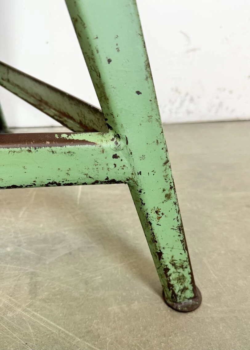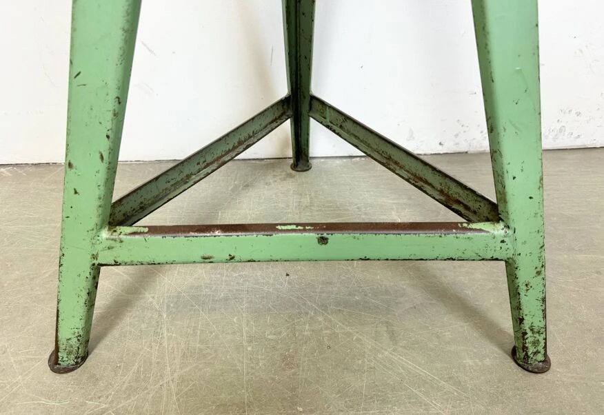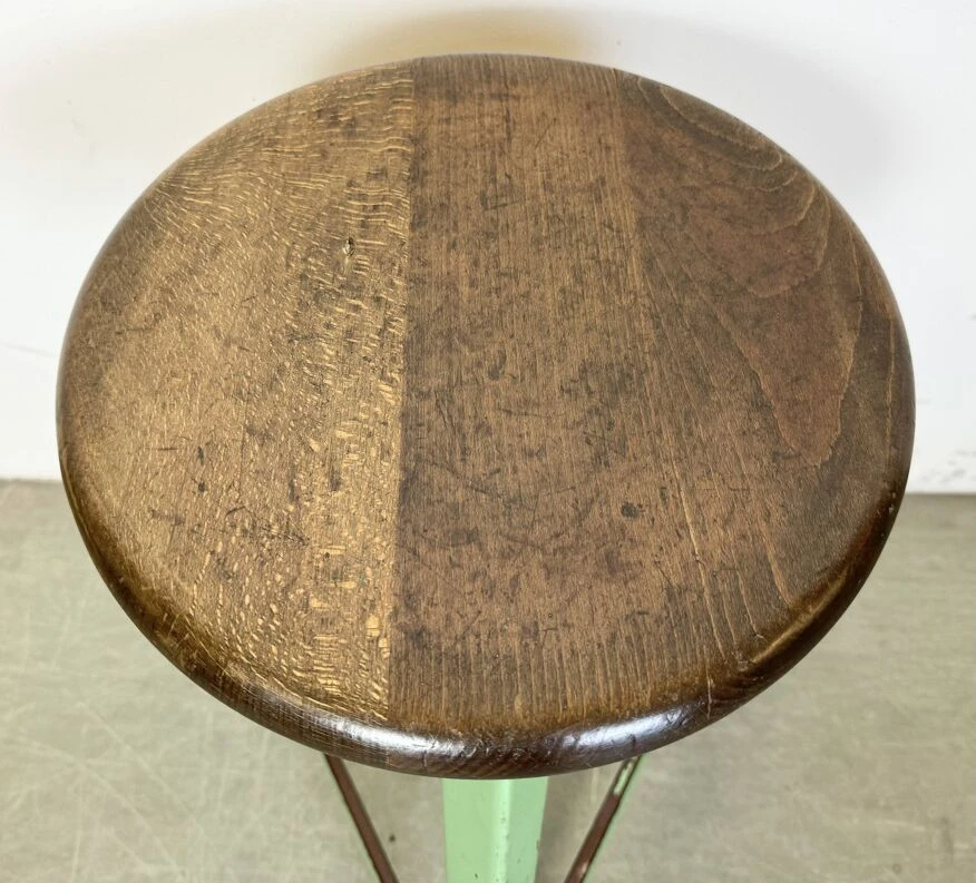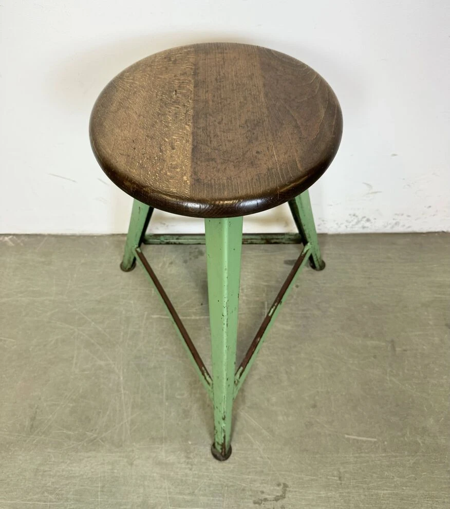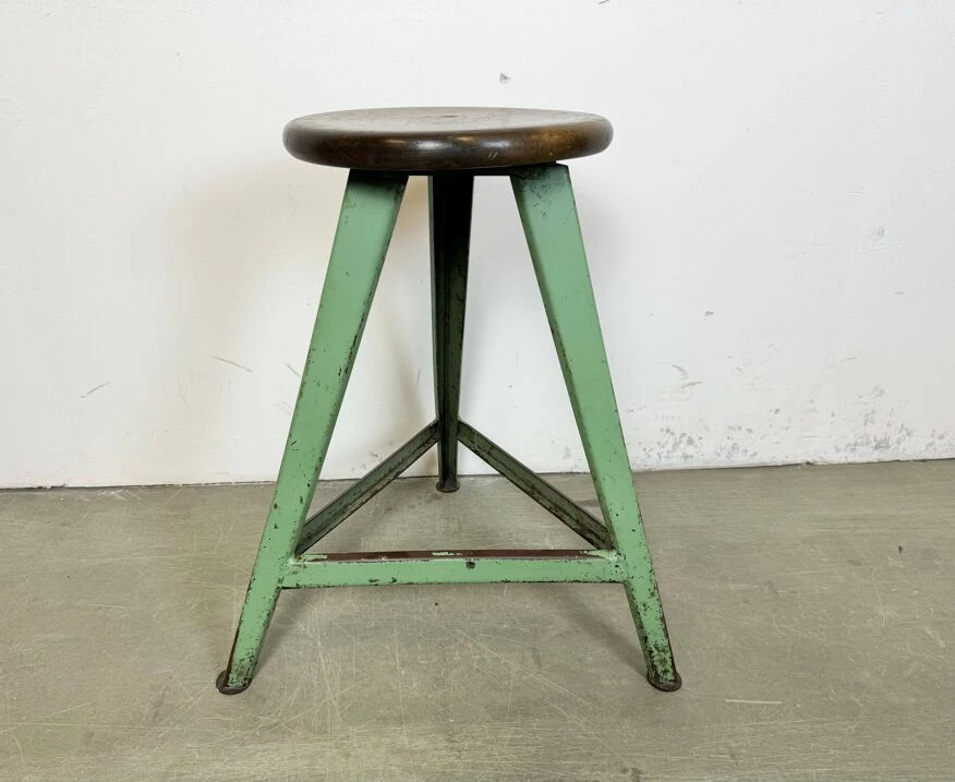 Vintage industrial factory stool made in former czechoslovakia during the 1960s it features a wooden seat and a green metal frame.