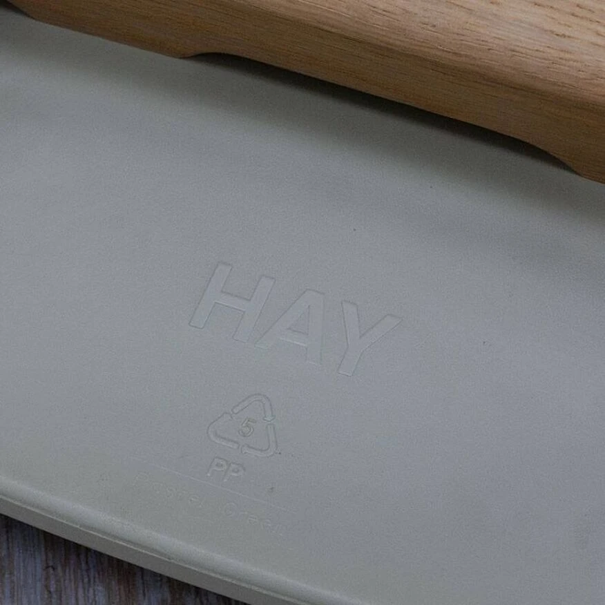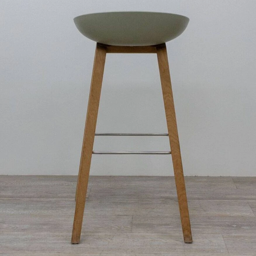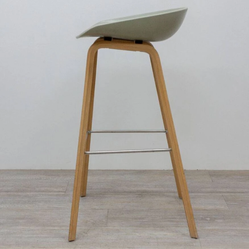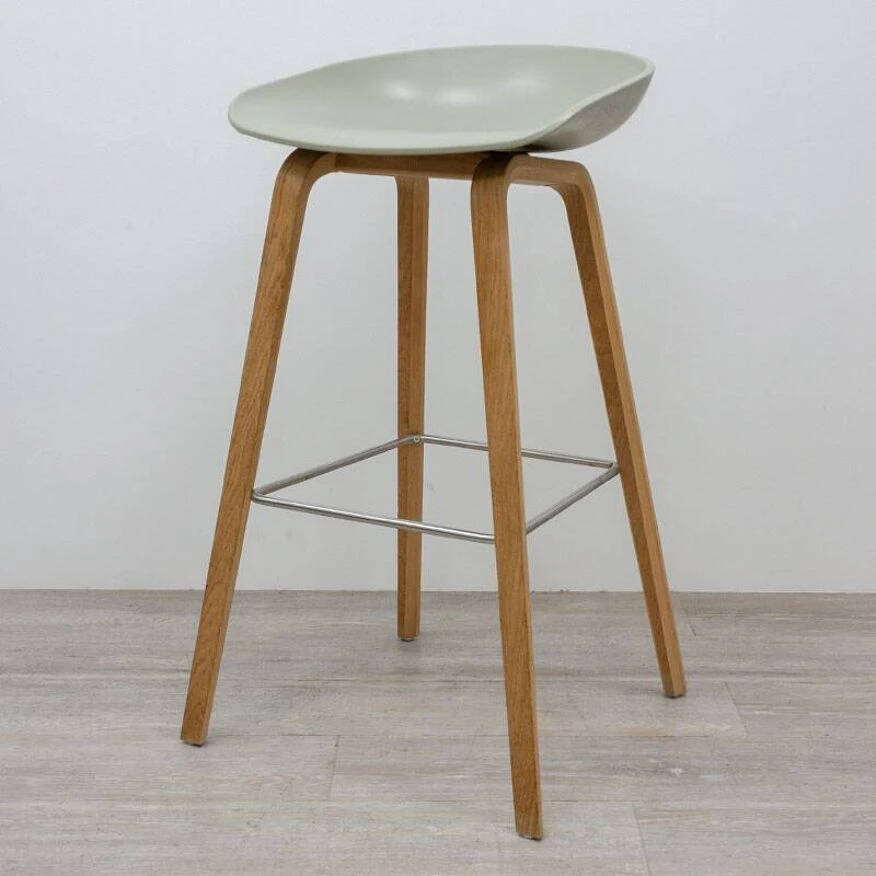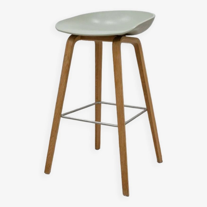 About a stool aas32 bar stool from hay designed by hee welling. This stool has a molded polypropylene shell with a pastel green finish and an oak base. Seat height of 75 cm.