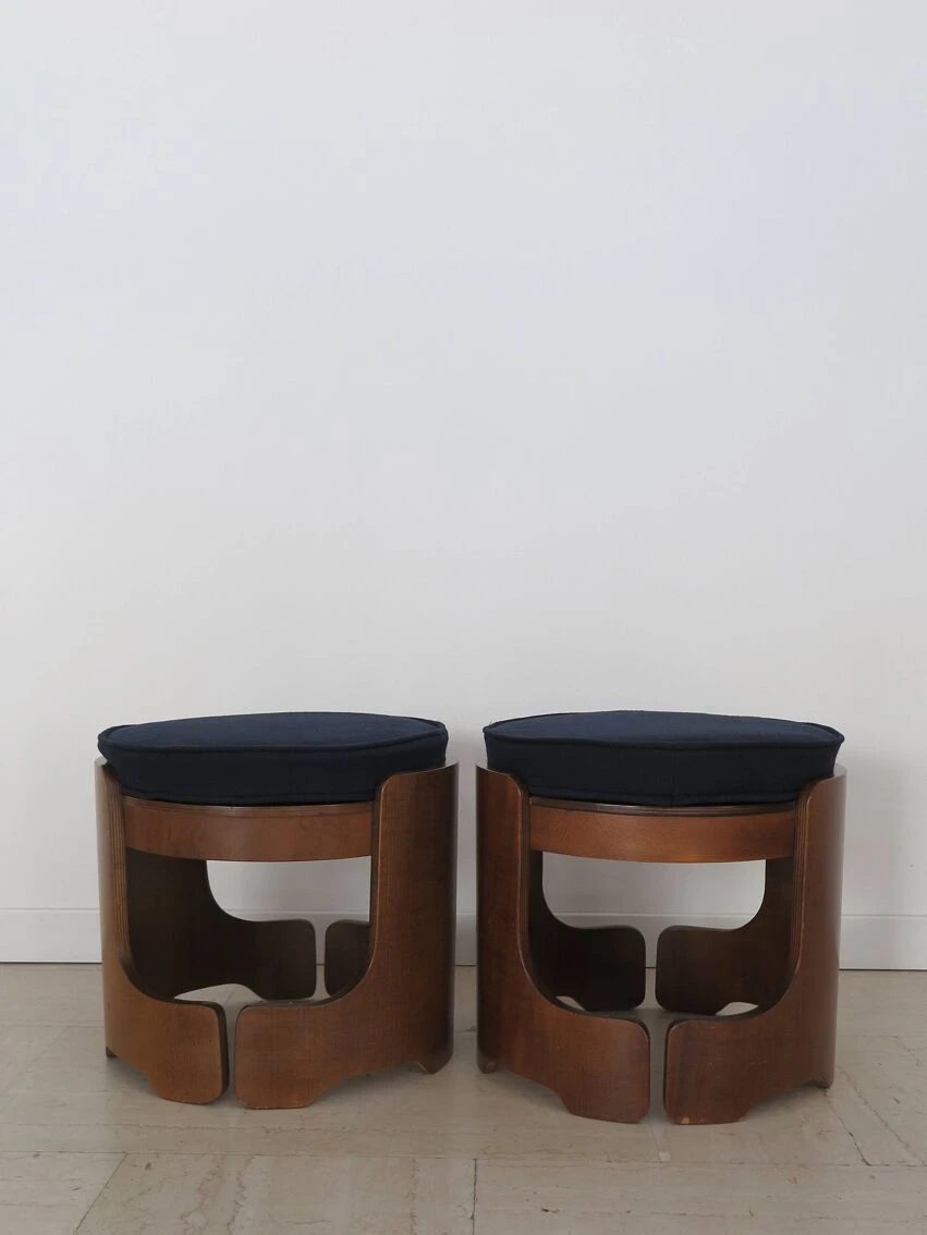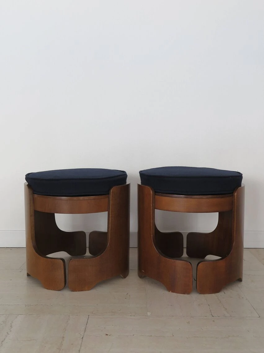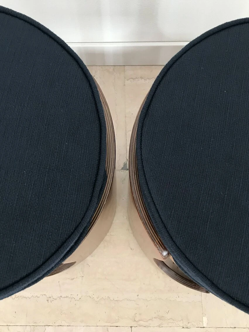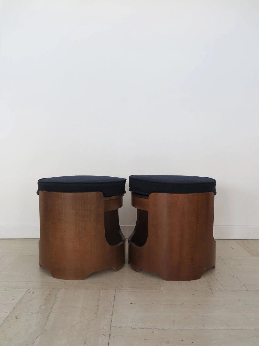 Pair of italian midcentury modern design round stools in walnut wood with cushions covered in dark blue fabric, italy 1960s.