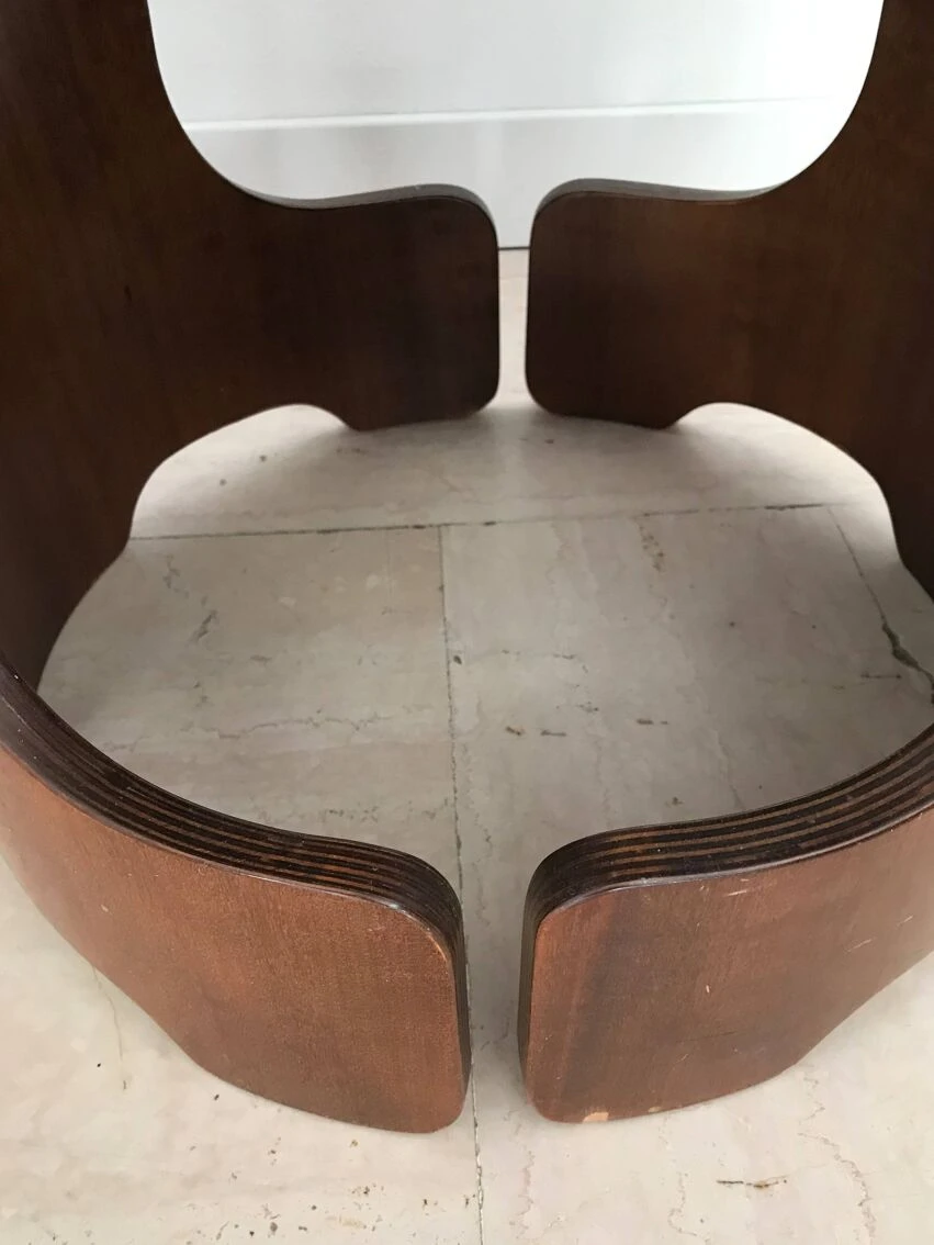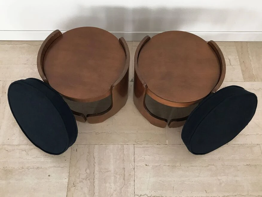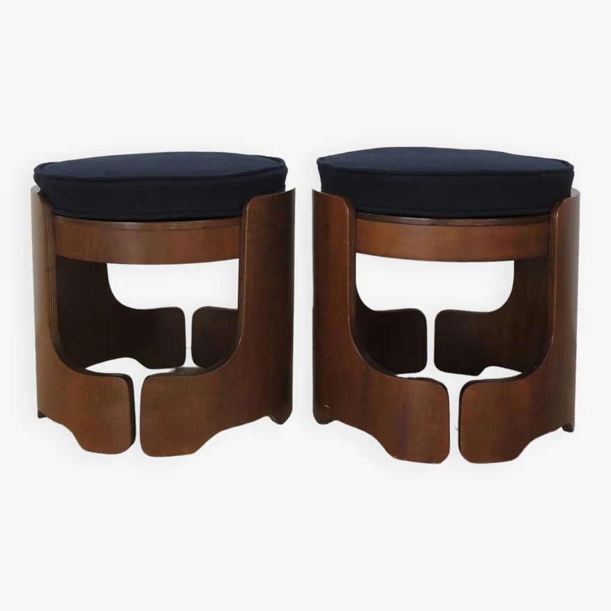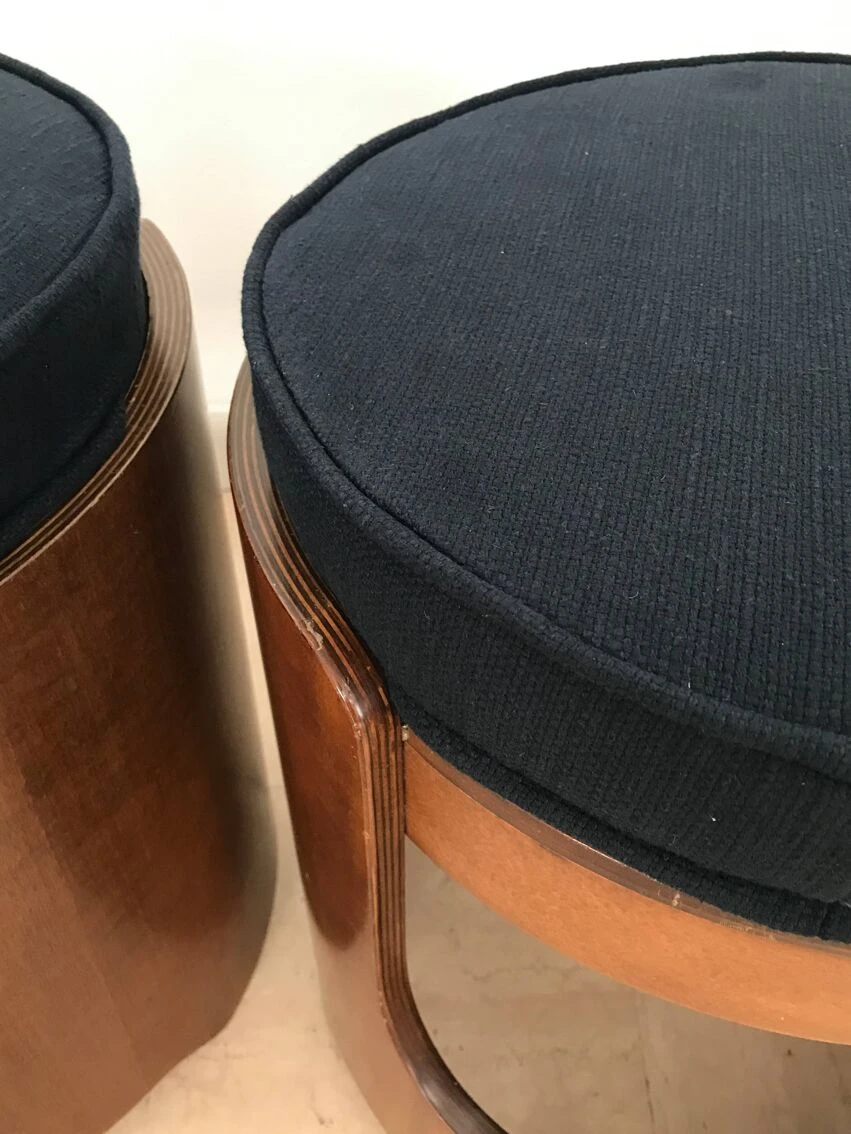 Pair of italian midcentury modern design round stools in walnut wood with cushions covered in dark blue fabric, italy 1960s.