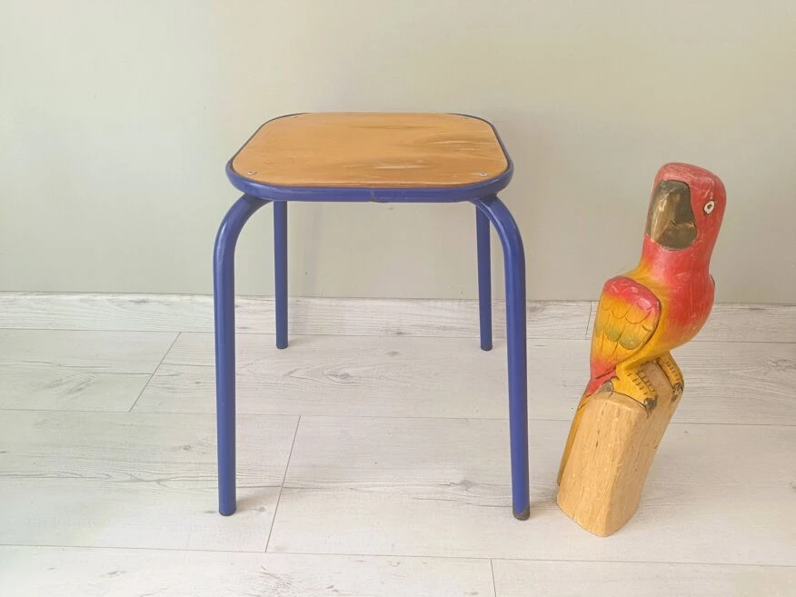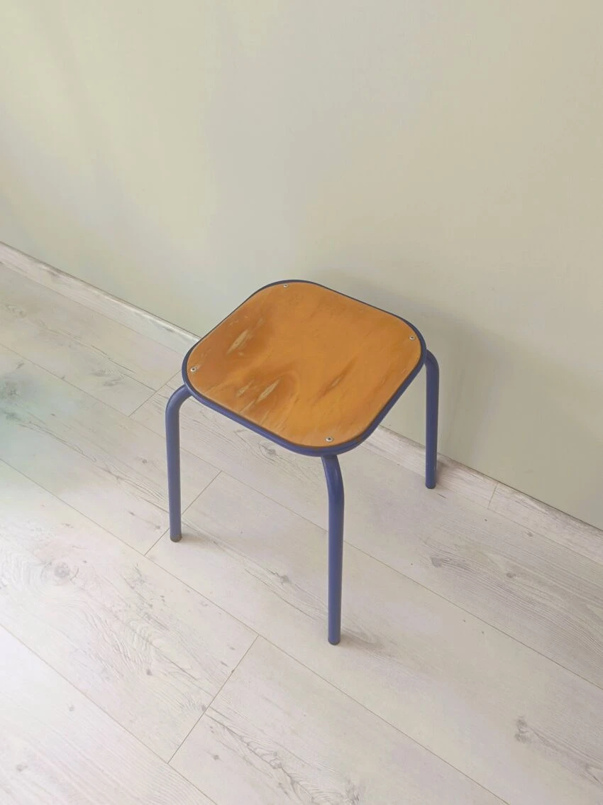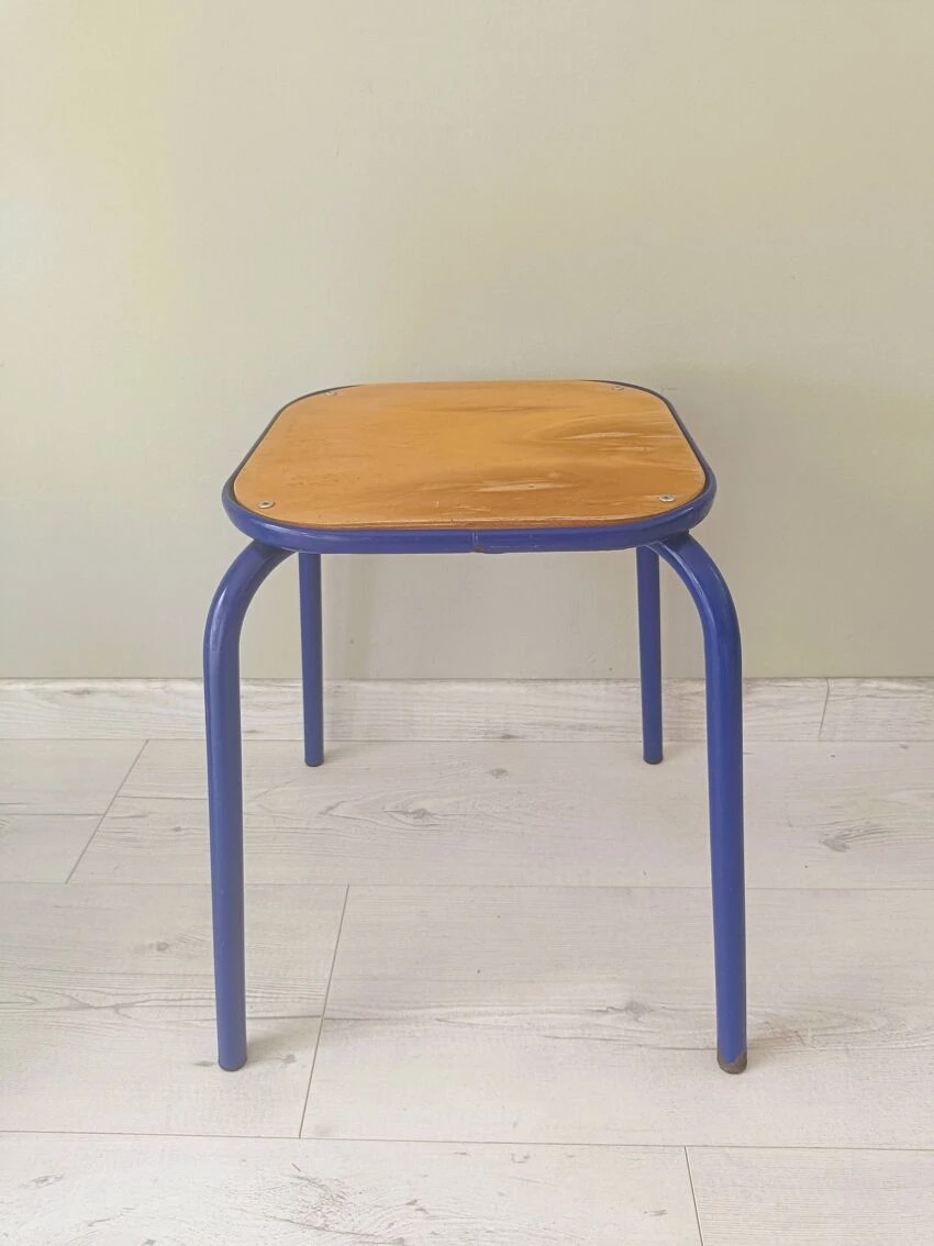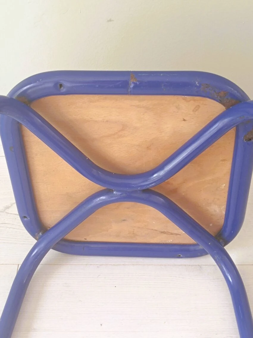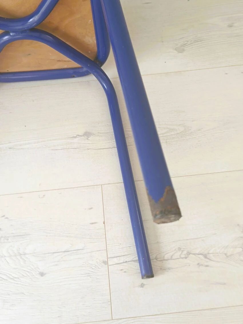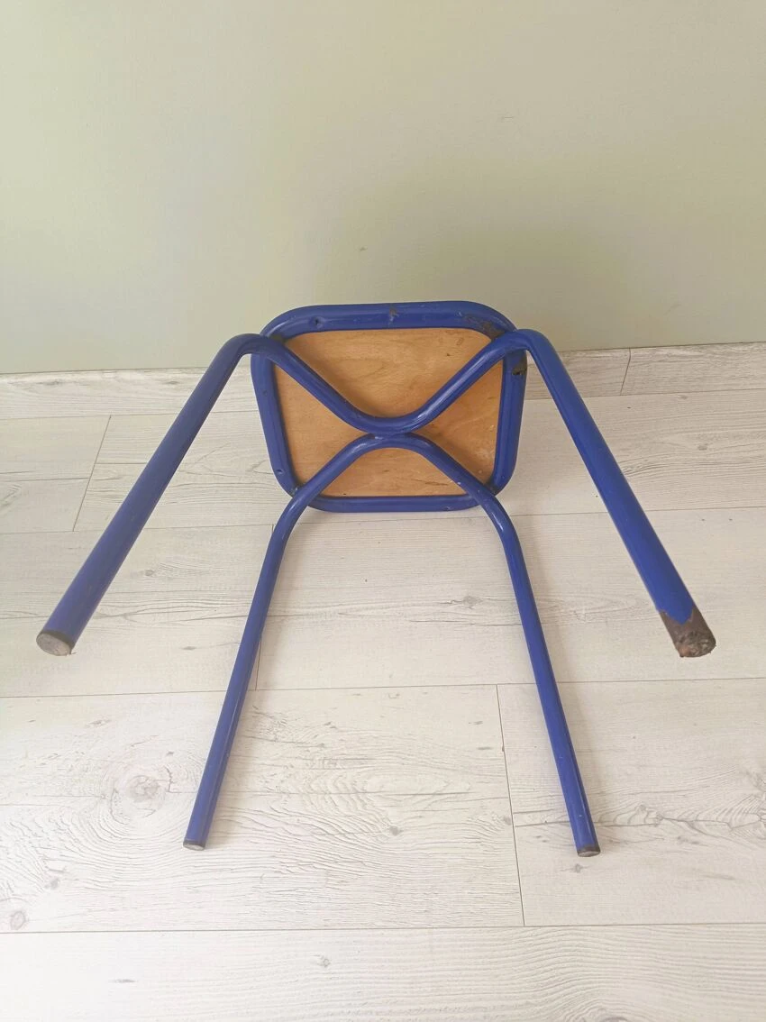 The square-shaped seat is in varnished beech, it is placed on a tubular metal structure painted blue.