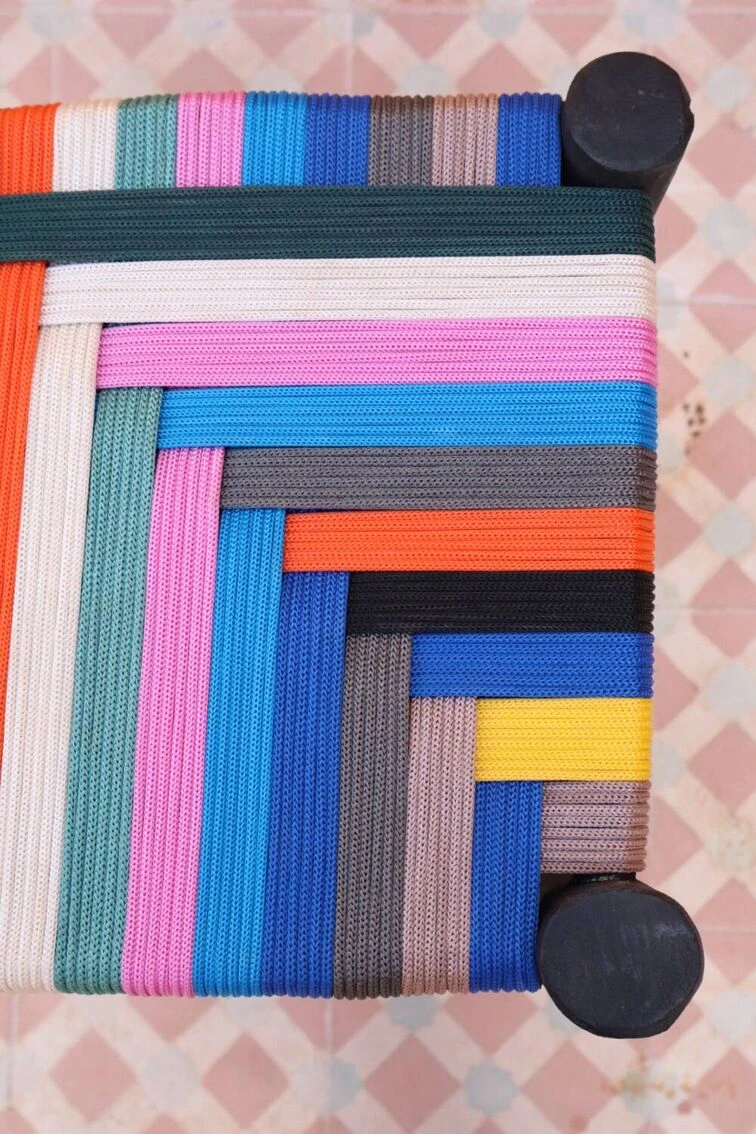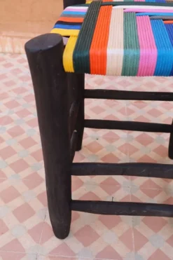 Discover our handmade moroccan stool, with a black painted wooden structure and a woven multicolored nylon seat.