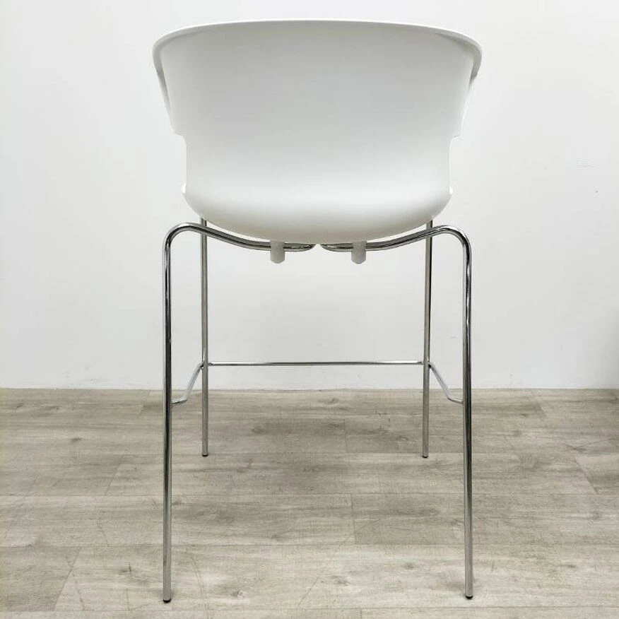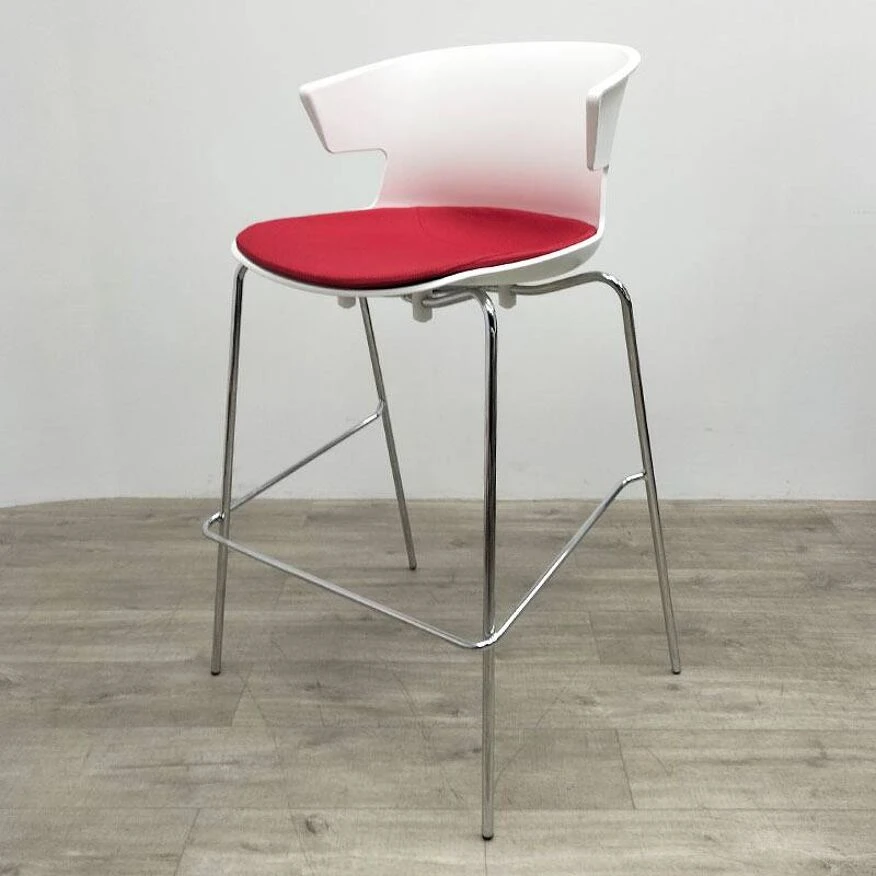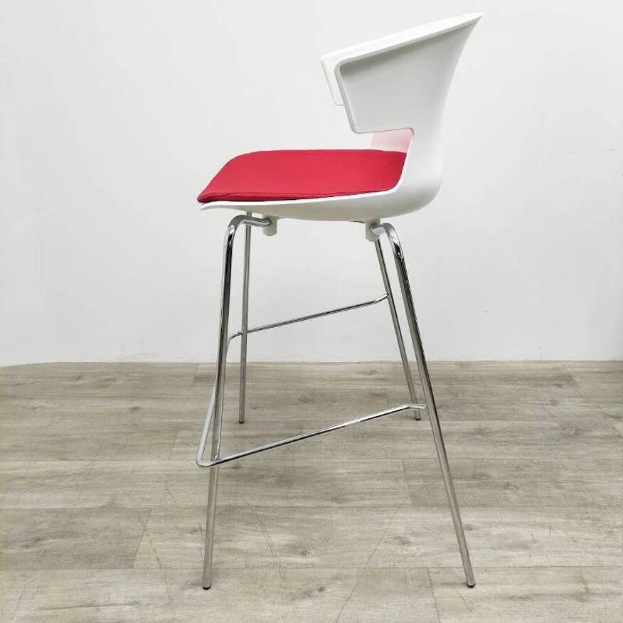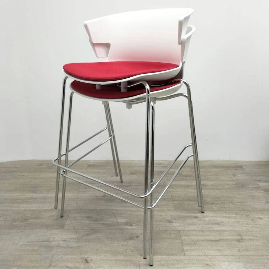 These stools have a white polypropylene shell, a chrome metal base and a removable red fabric pad.