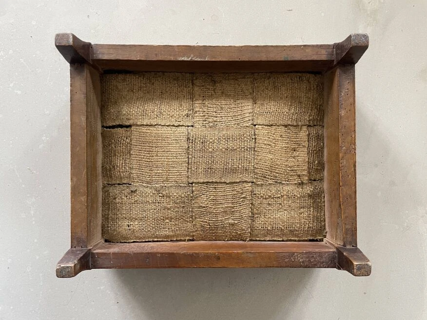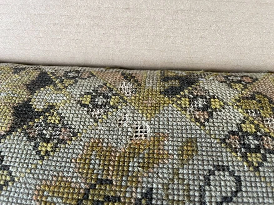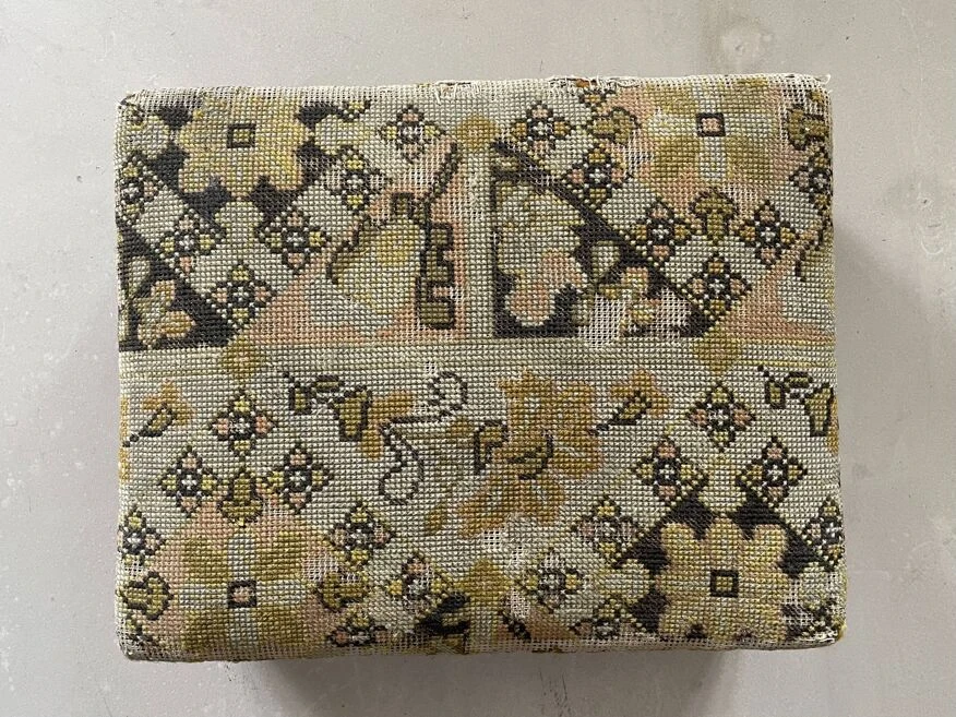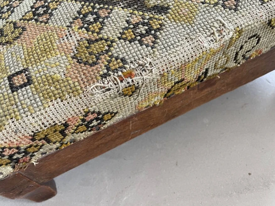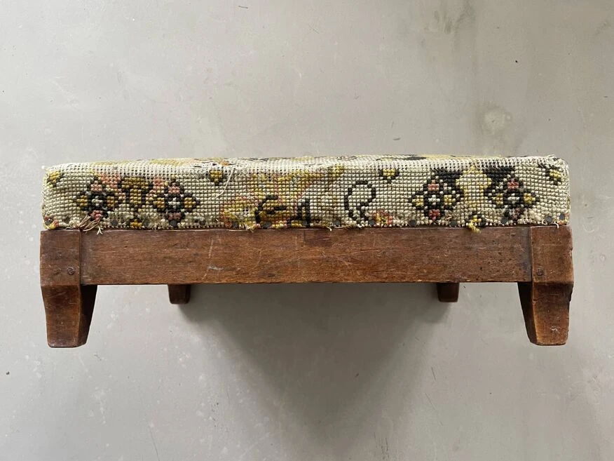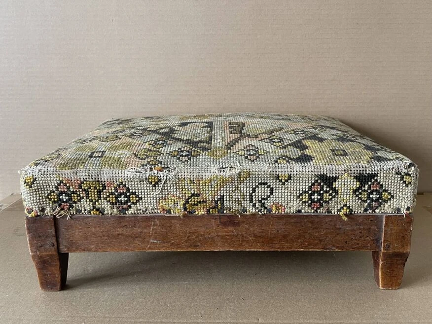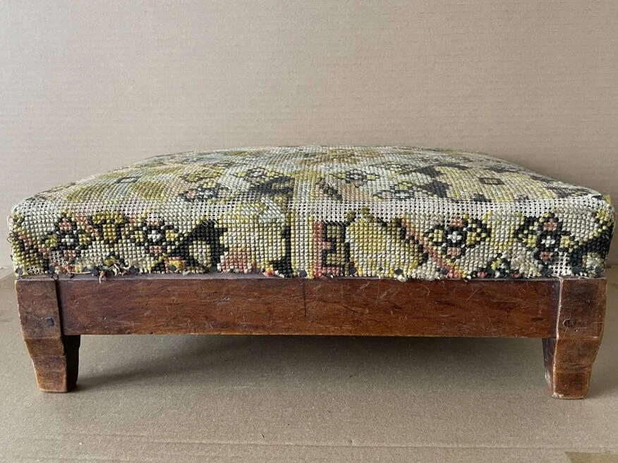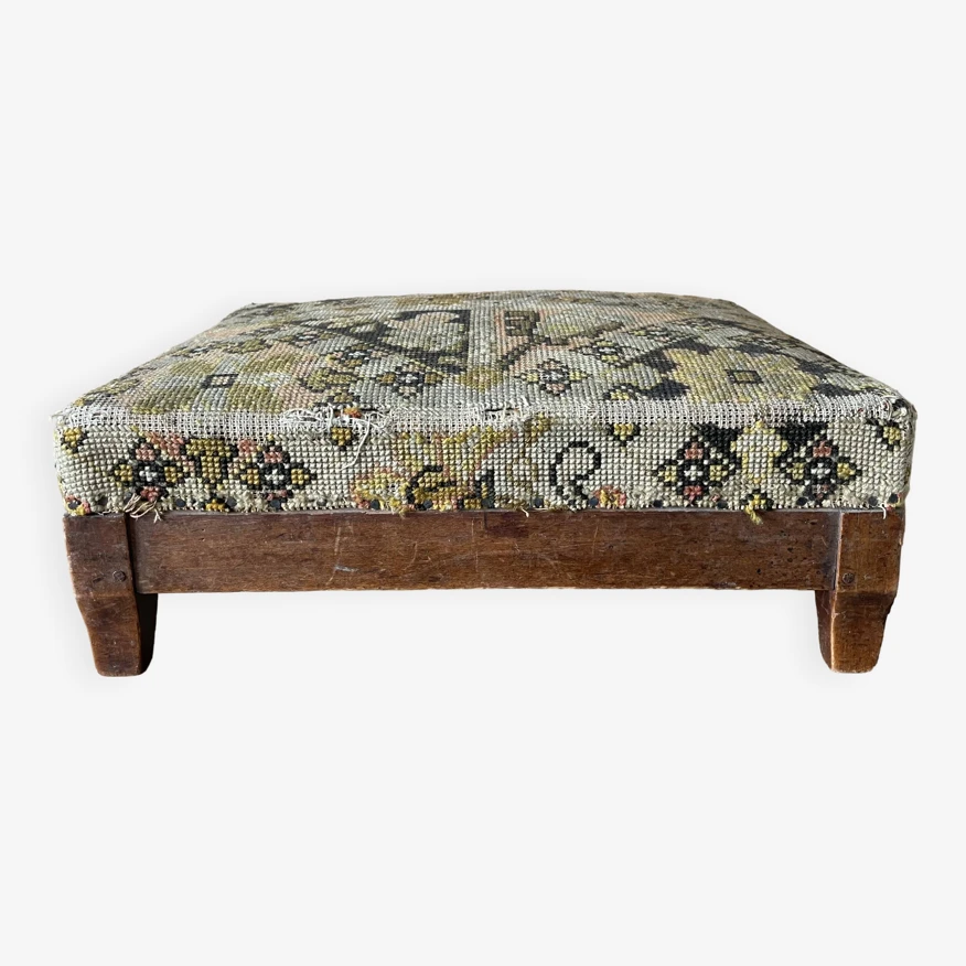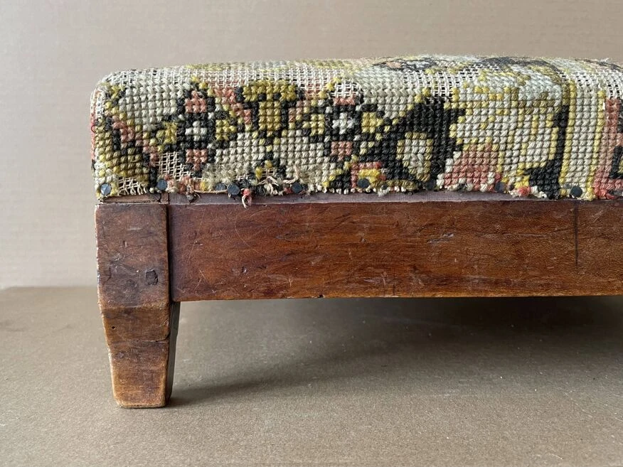 Footstool, old pouf, low stool 19th century fruit wood, tapestry, canvas on top structure in good condition, worn tapestry on the corners.