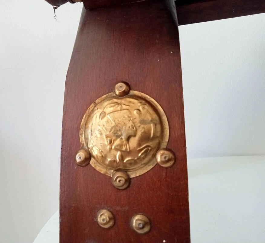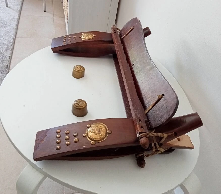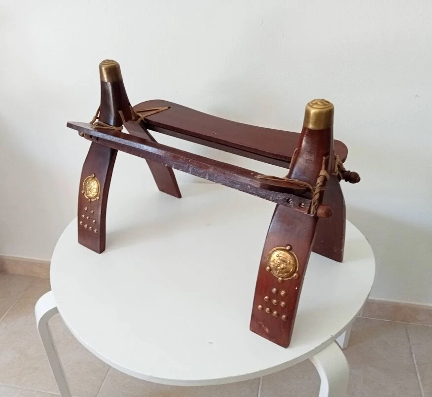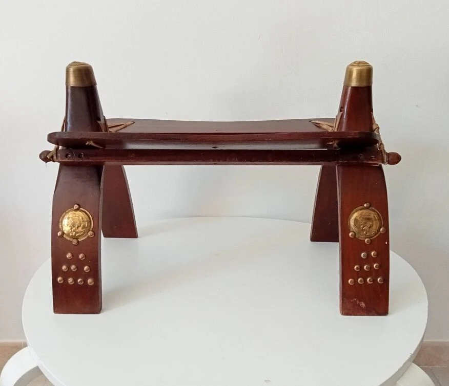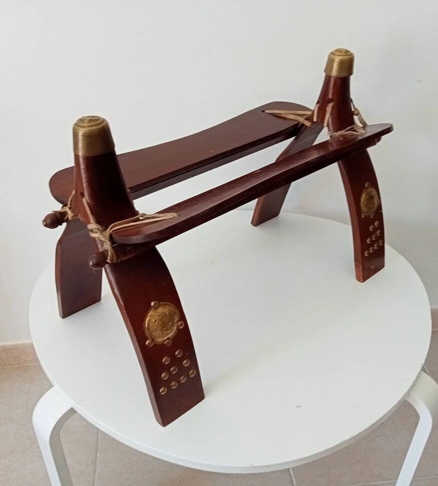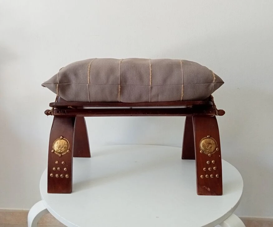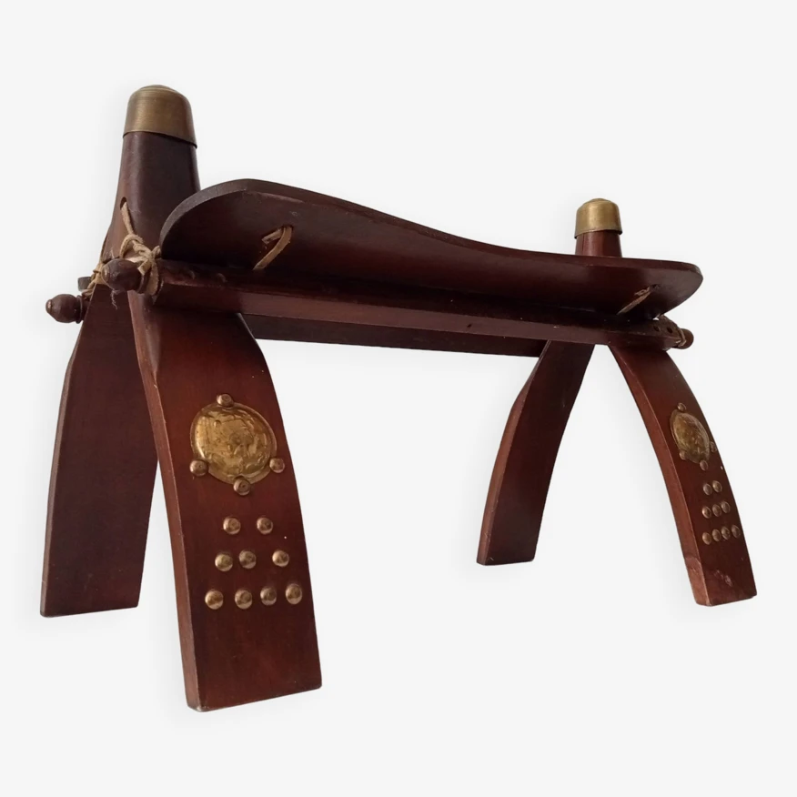 Superb authentic camel chair, “egyptian” chair of moroccan manufacture, foldable, purchased in the 60s in morocco by the parents of the former owners of this very beautiful piece, in beautiful condition, in wood, leather laces and brass ornaments, solid and stable, can be used as a stool, footrest, in addition to being a very decorative piece, seat dating from the purchase, for more rendering a seat to your taste will be easily achievable.