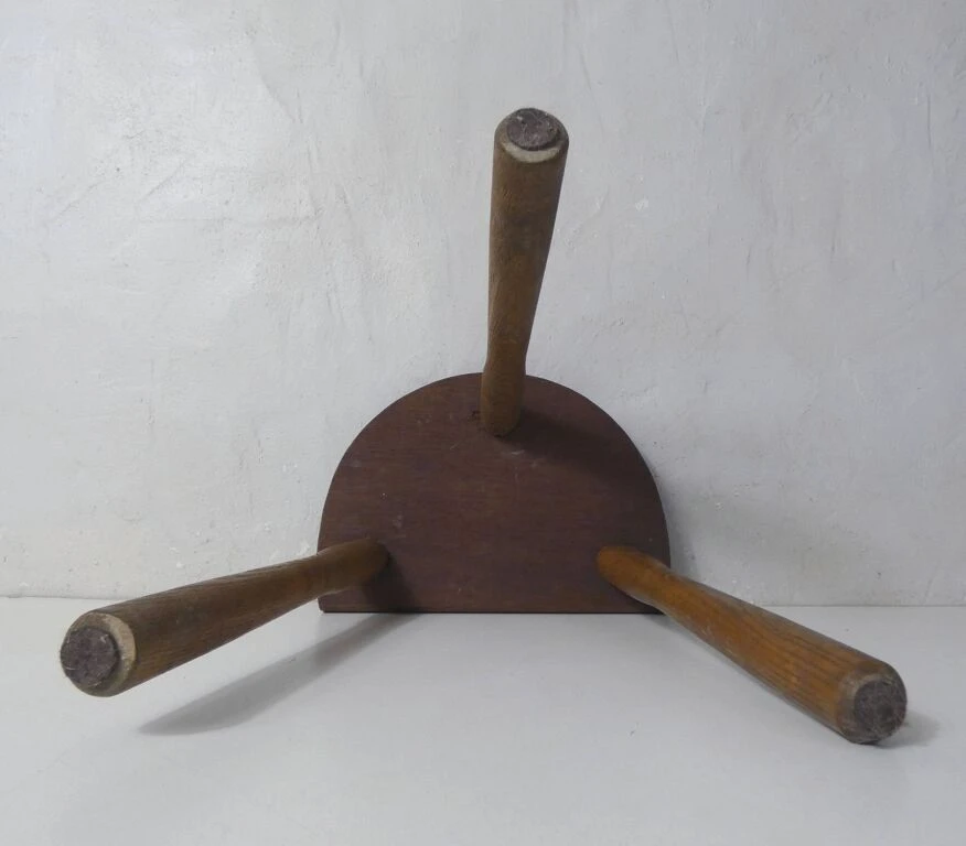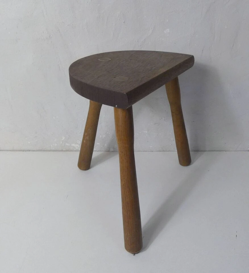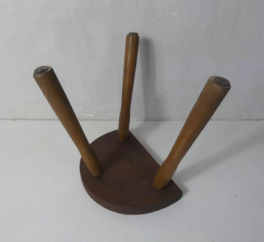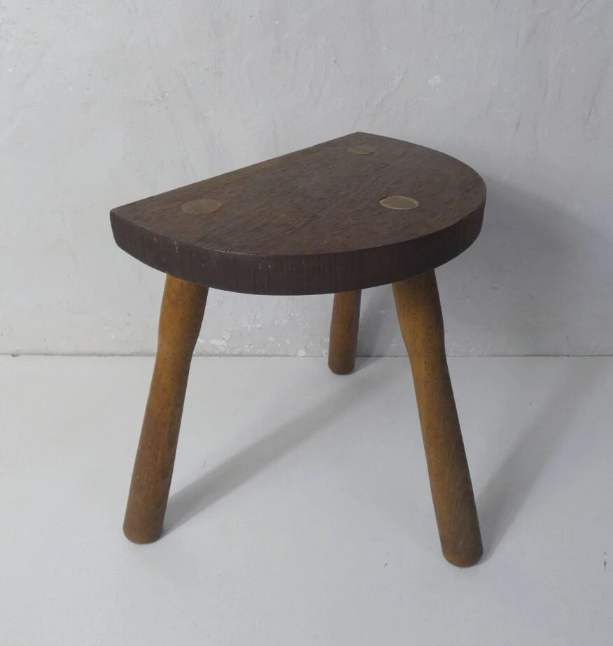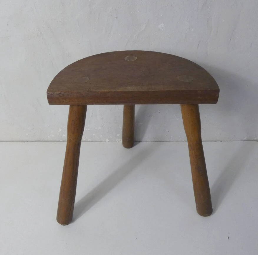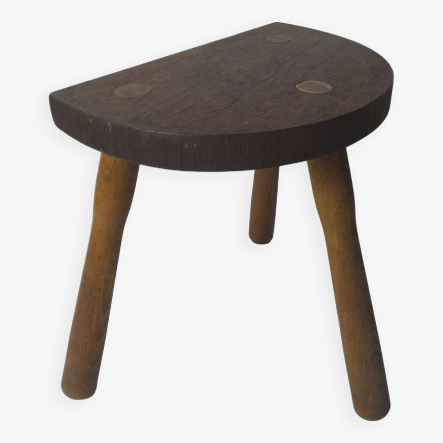Old small milking bench, half-moon tripod, in solid wood.