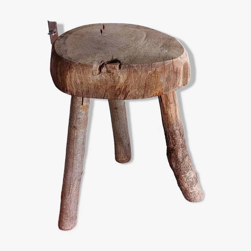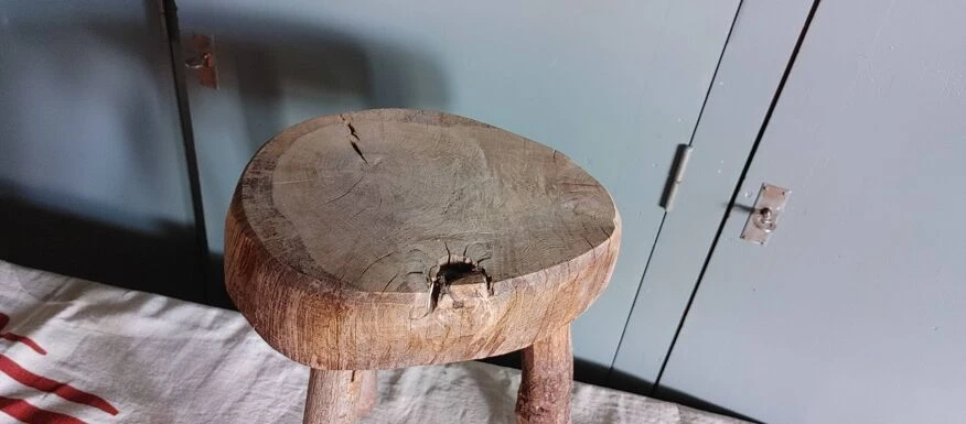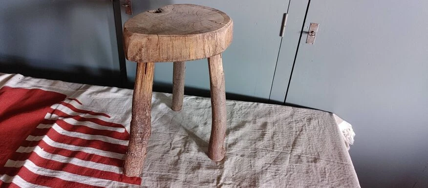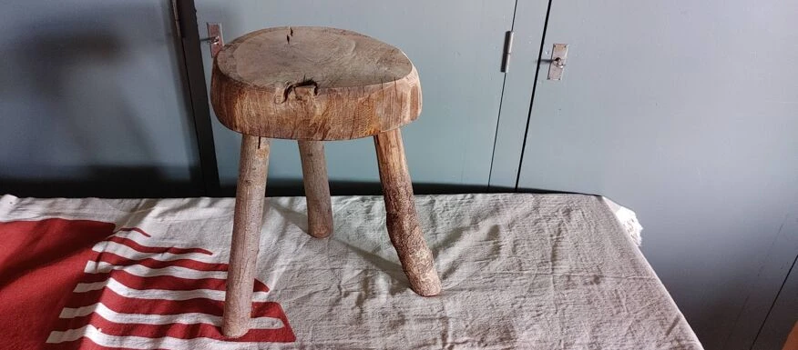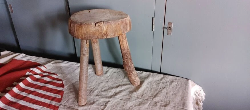 Old stool in raw wood, peasant folk art, stable, beautiful condition!