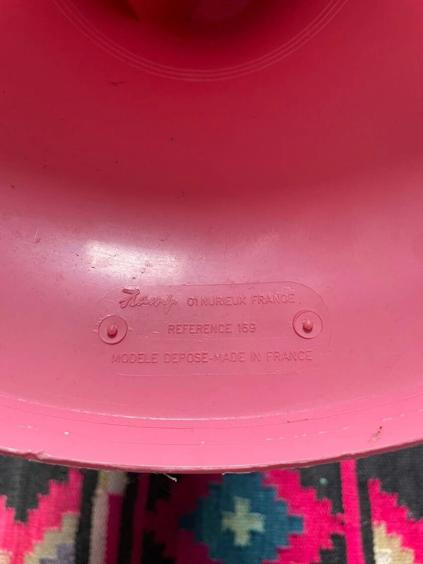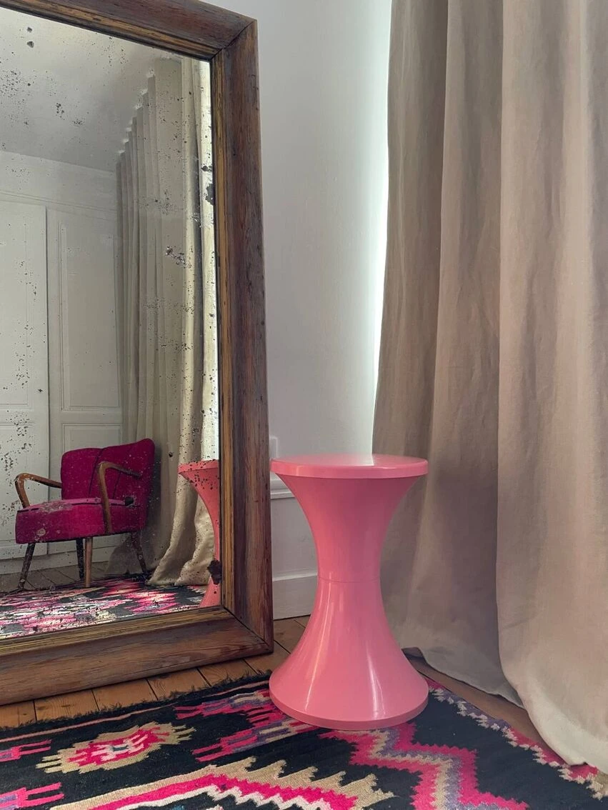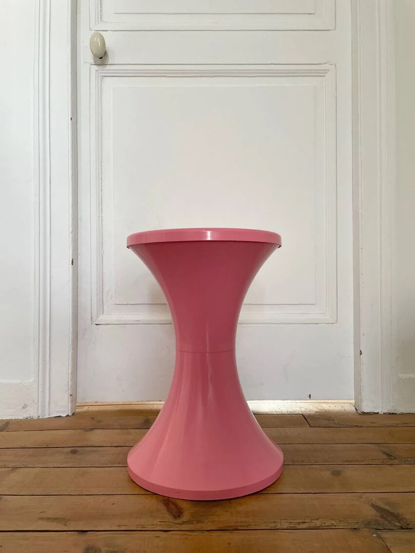 Pretty original Tam-Tam stool, Stamp Edition from the 1970s. Malabar pink in color, it is in good general condition. Very stable and perfectly usable as is. Superficial traces of use. Will be perfect as a small occasional stool in a bedroom, a bathroom… Height: 44 cm Seat diameter: 31 cm Weight: 1 KG Fast and careful shipping