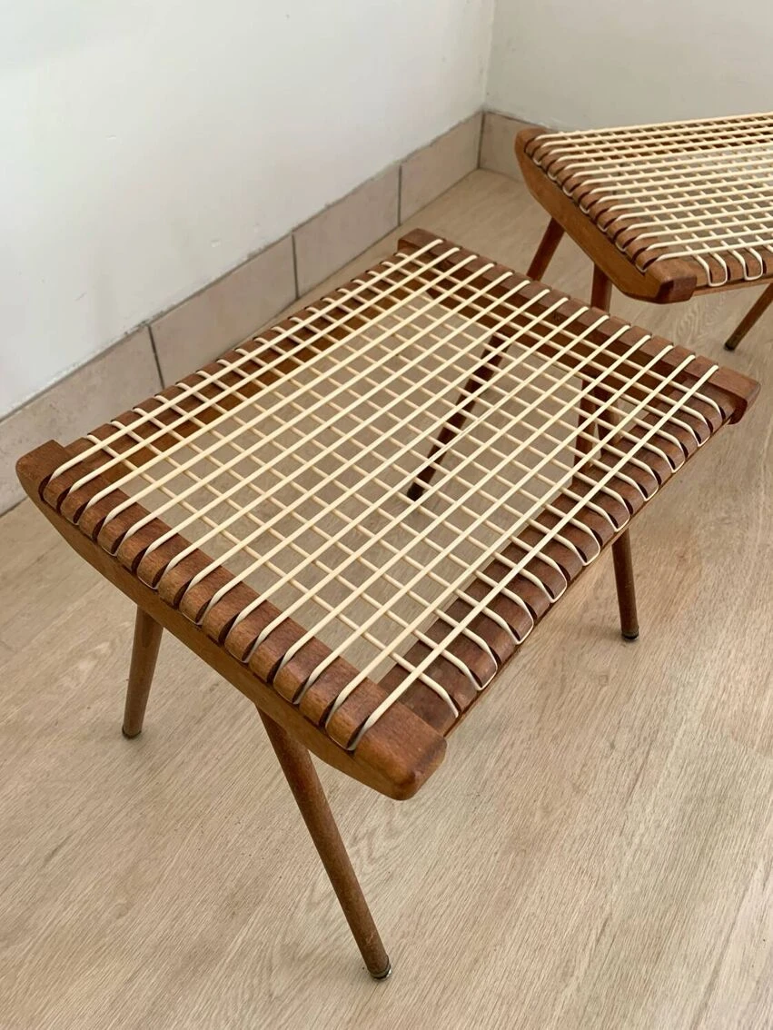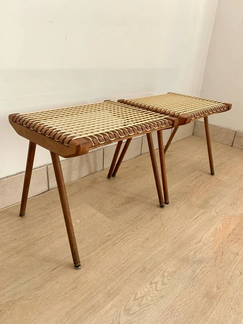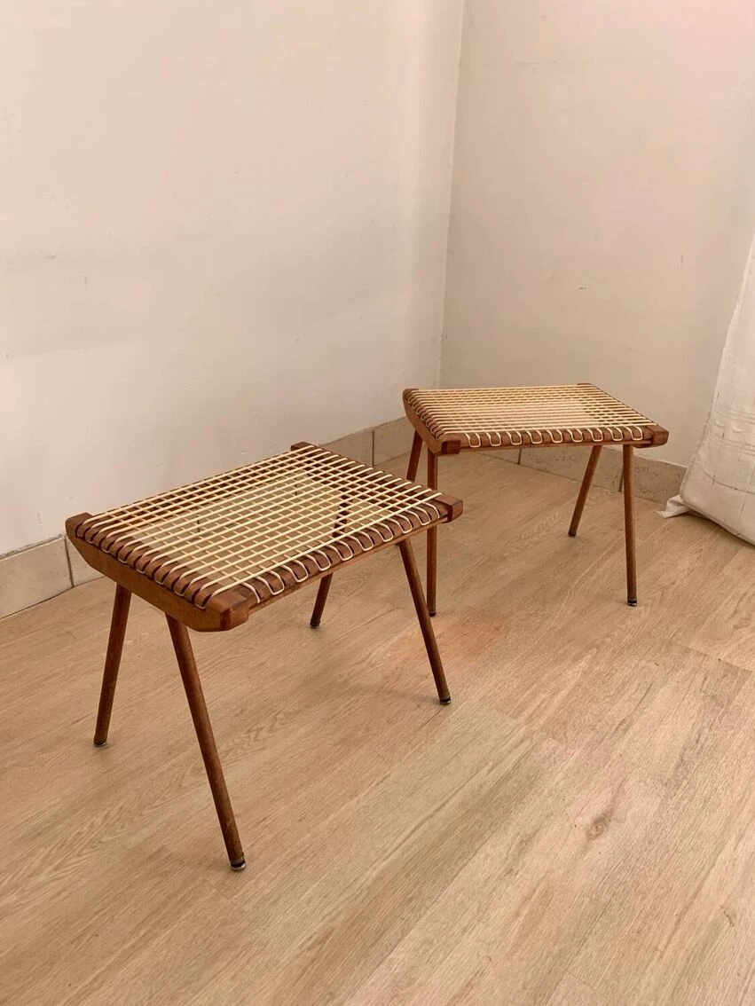 Pair of 1950s stools / end tables / magazine racks in light beech wood and top in woven plastic rods (known as “prenas wire”) by george tigien, meubles pradera editions.