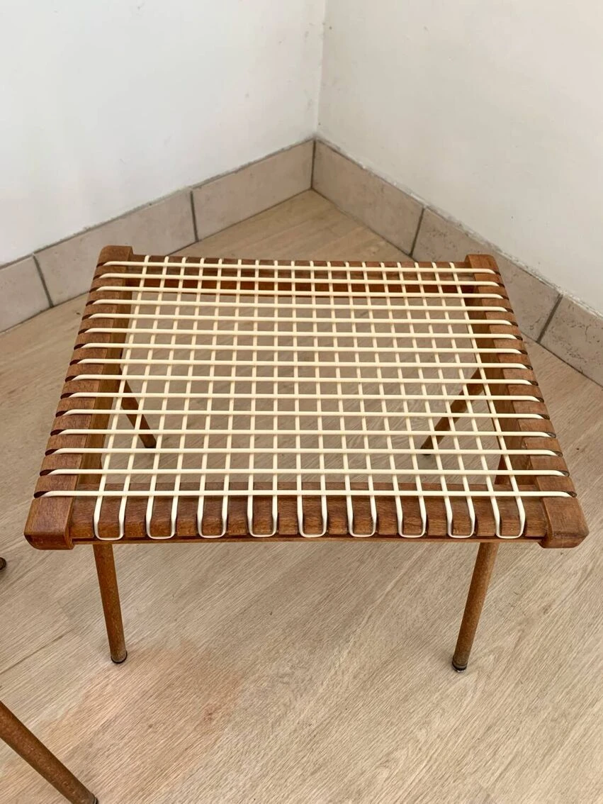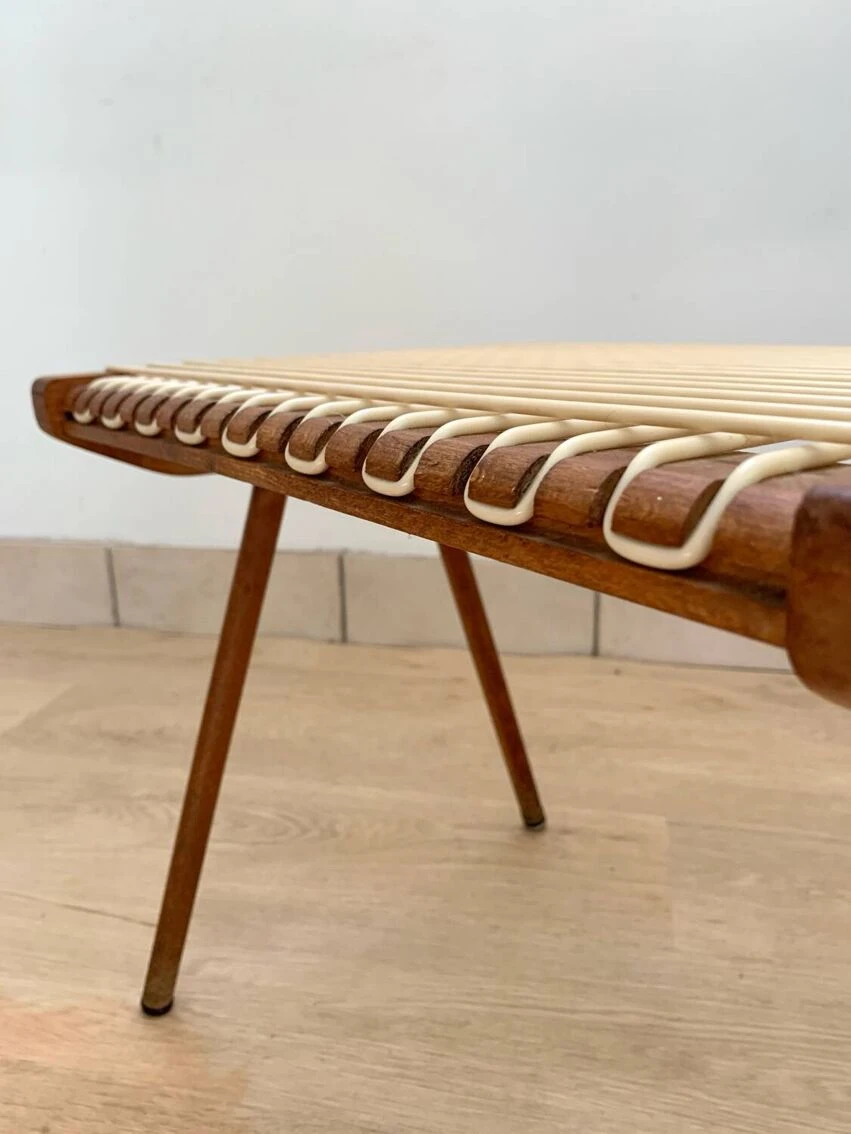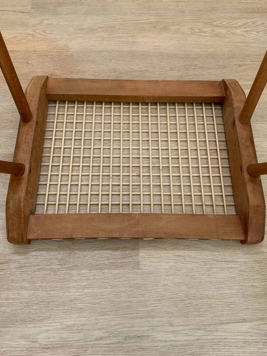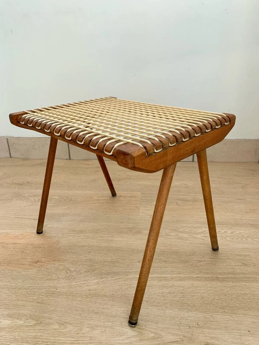 Pair of 1950s stools / end tables / magazine racks in light beech wood and top in woven plastic rods (known as “prenas wire”) by george tigien, meubles pradera editions.