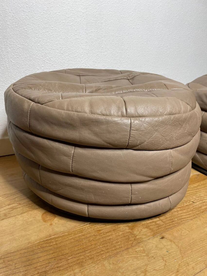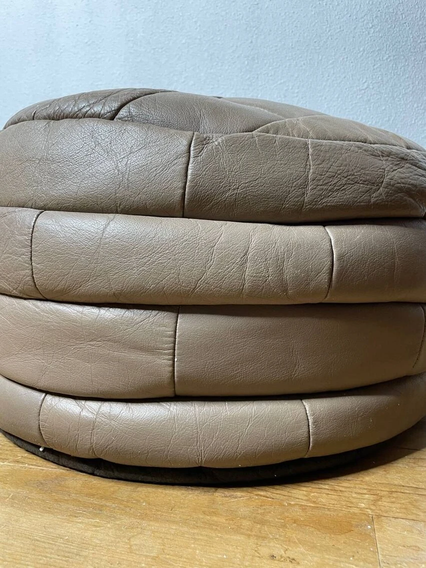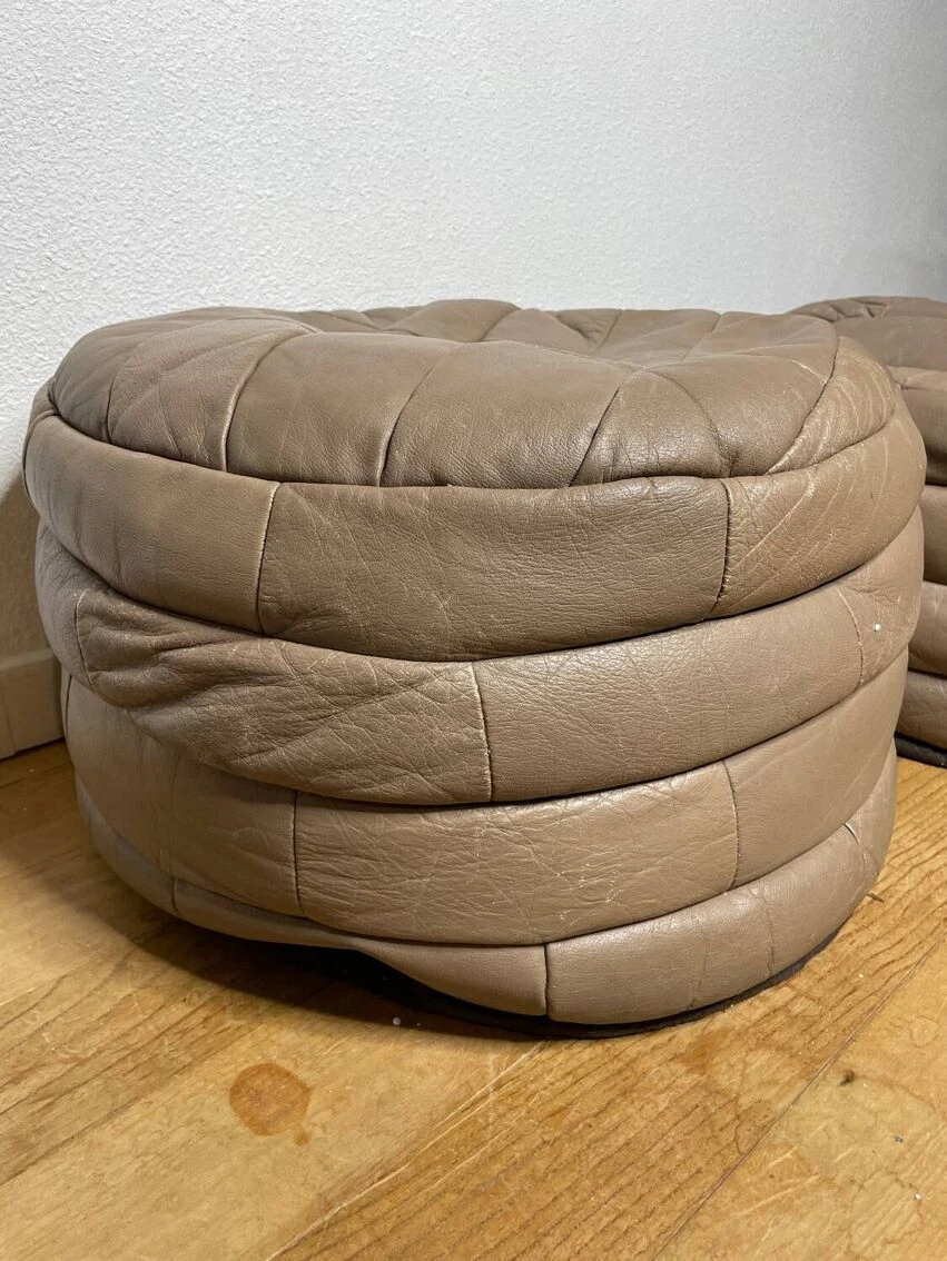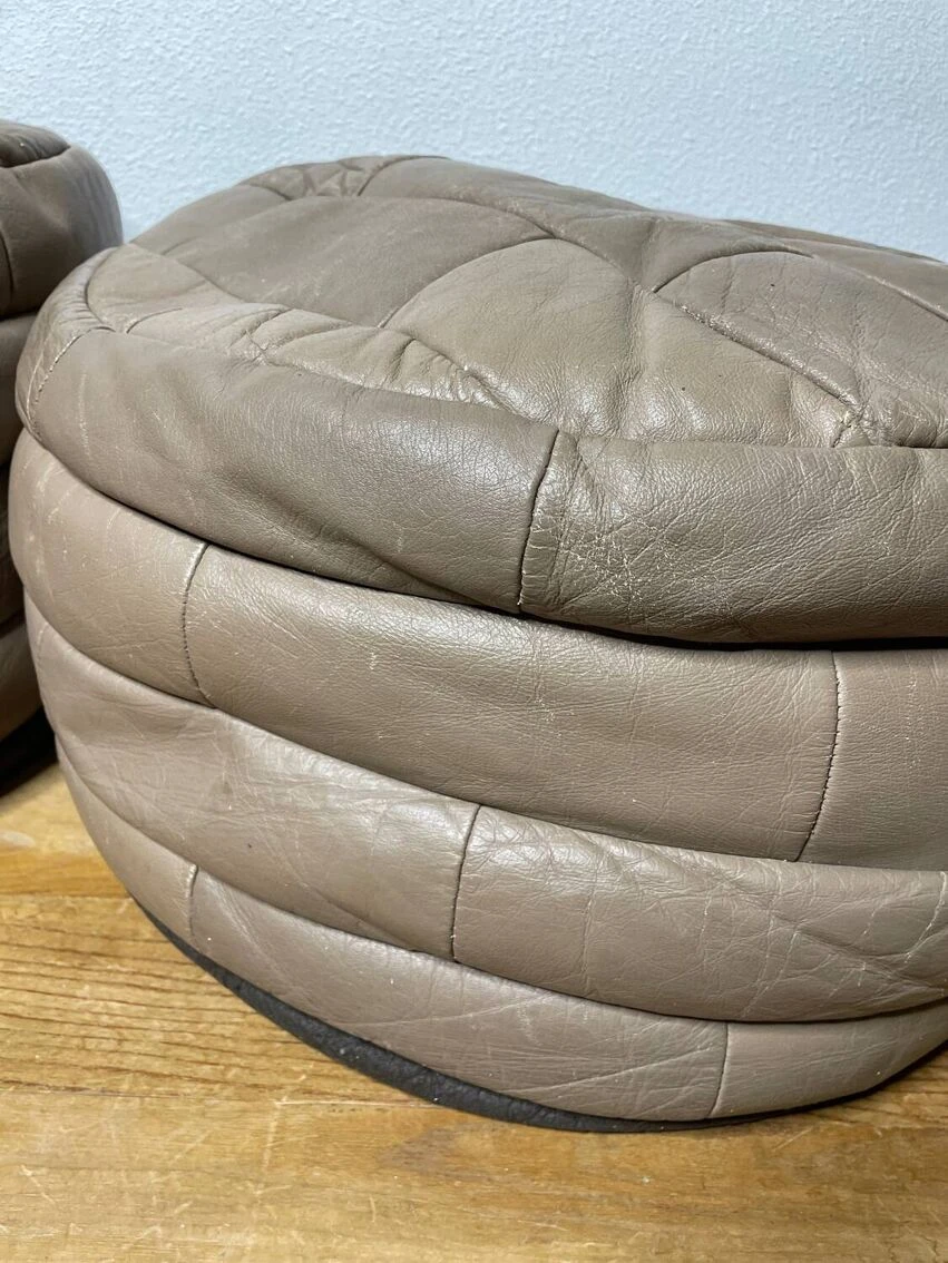 Pair of patchwork poufs in taupe gray leather. Attributed to the Swiss house of De Sède. Classic from the 70s. Comfortable seat and very nice decorative element. Good general condition for the period, beautiful patina. Note traces of wear and time on the leather. (see photos) Dimensions Height: 28 cm Diameter: 50 cm The dimensions may vary depending on the padding, to be adapted according to your convenience. Sold with padding. Other models available, do not hesitate to contact me.