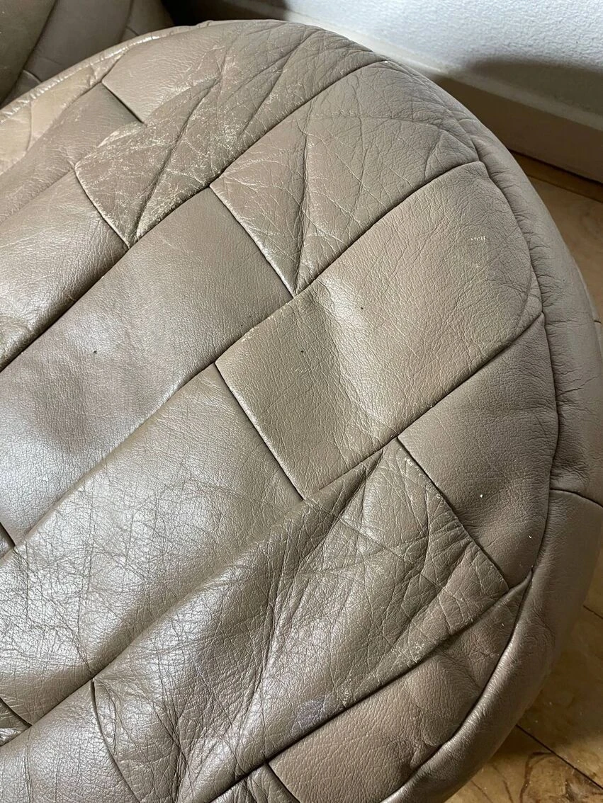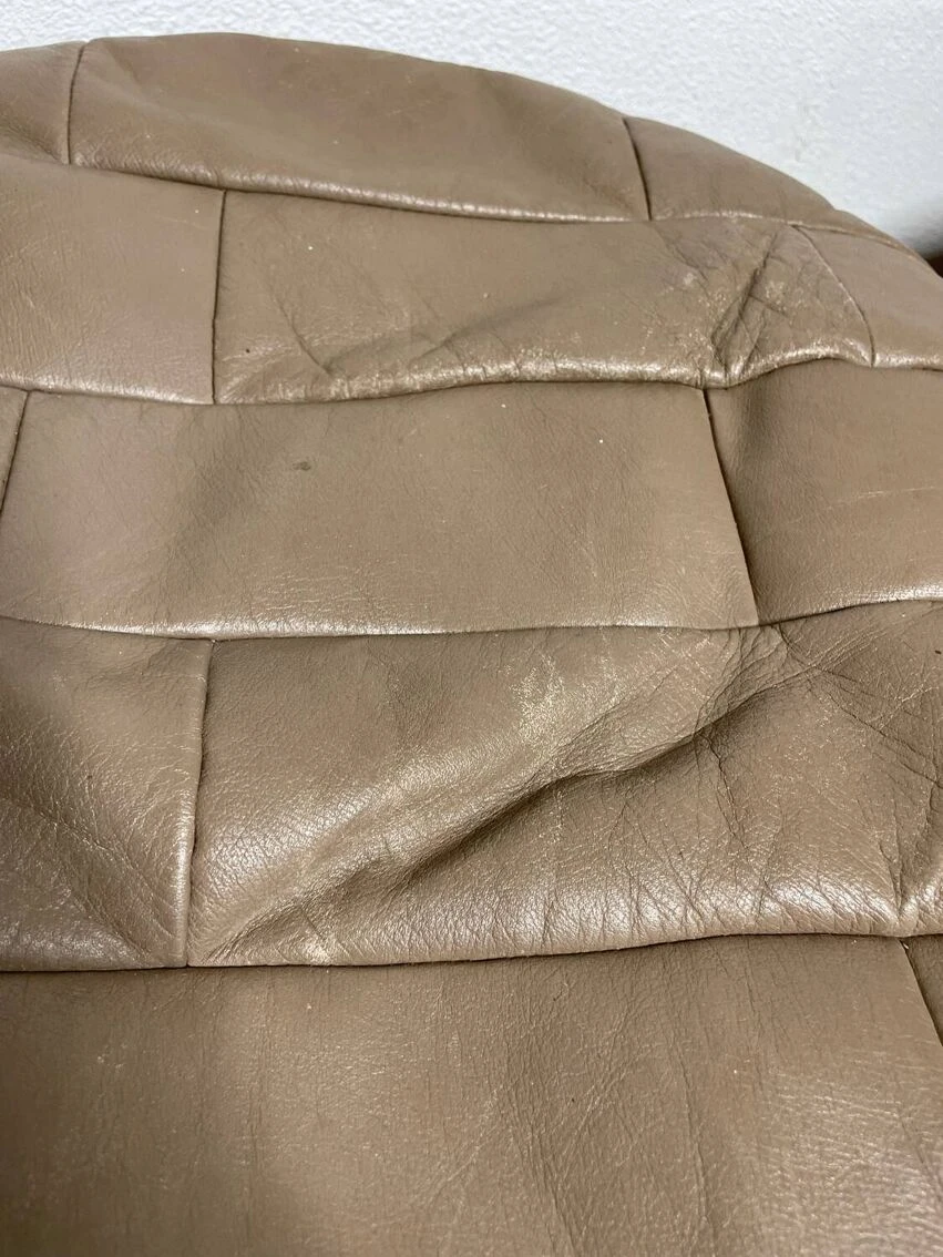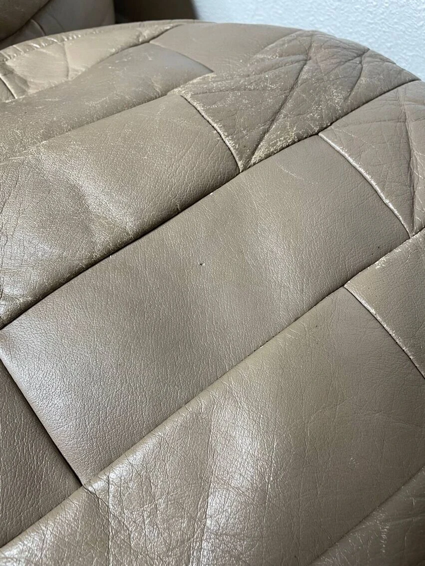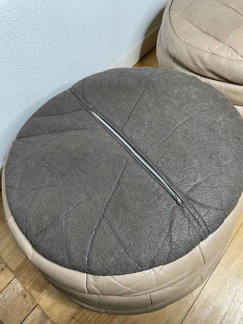Pair of patchwork poufs in taupe gray leather. Attributed to the Swiss house of De Sède. Classic from the 70s. Comfortable seat and very nice decorative element. Good general condition for the period, beautiful patina. Note traces of wear and time on the leather. (see photos) Dimensions Height: 28 cm Diameter: 50 cm The dimensions may vary depending on the padding, to be adapted according to your convenience. Sold with padding. Other models available, do not hesitate to contact me.