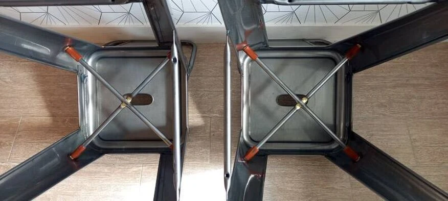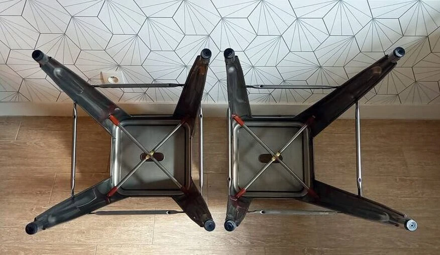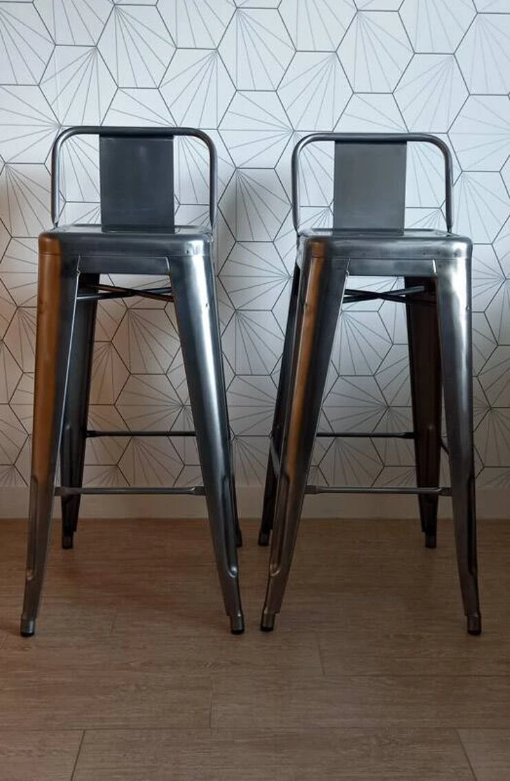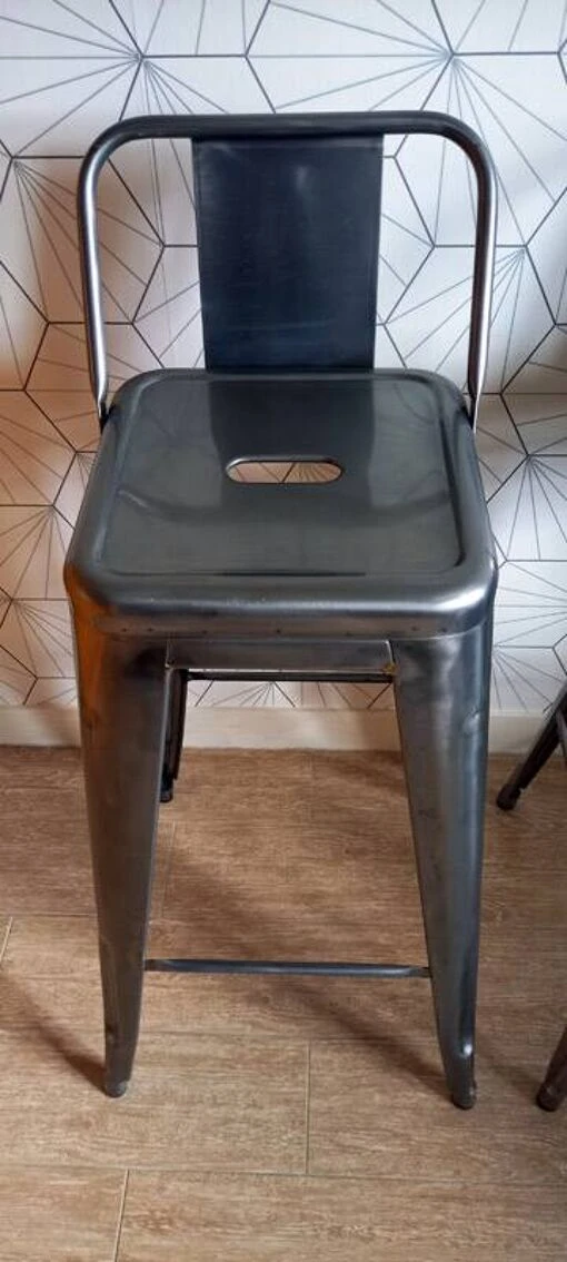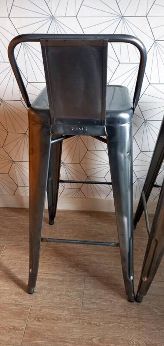 Pair of authentic Tolix high bar stools (hpd 75 model), after Xavier Pauchard (1936). Varnished raw steel color, they are in very good condition and have retained all their shine. Dimensions (in cm): total back height 94, seat height 75, floor dimensions 43.5 x 43.5, seat 30×30. Weight: 6.25 kg each.