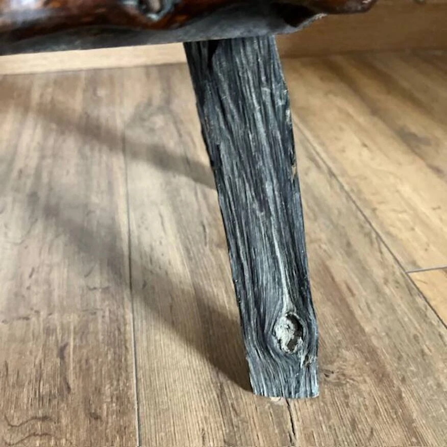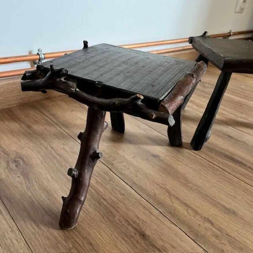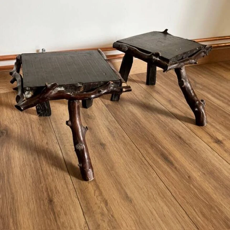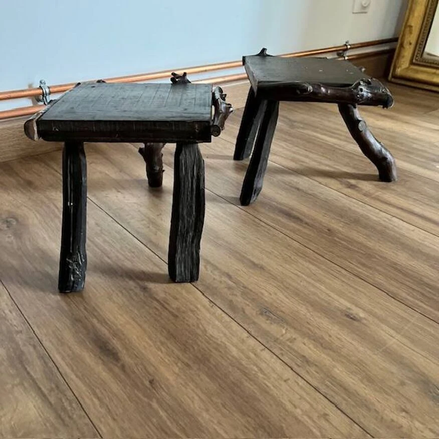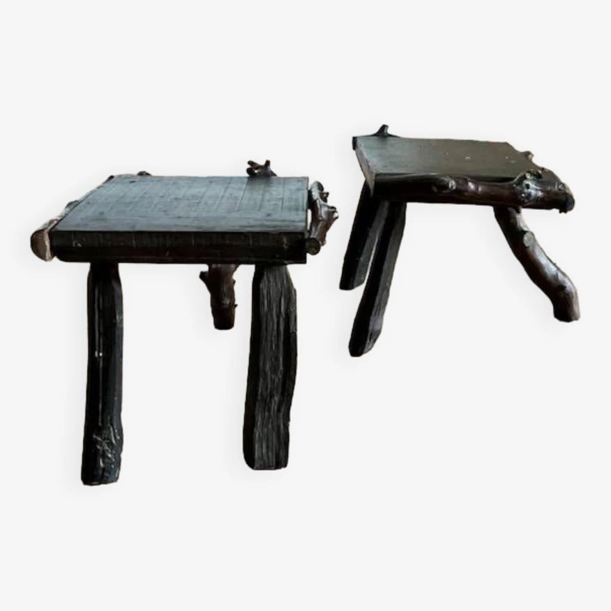 Discover the rustic elegance of these dark wood tripod stools, featuring a unique seat surrounded by sculpted branches.