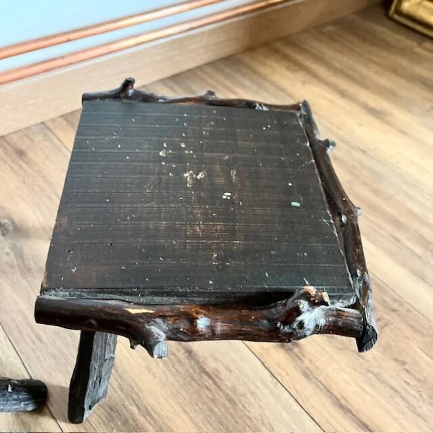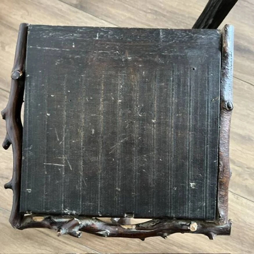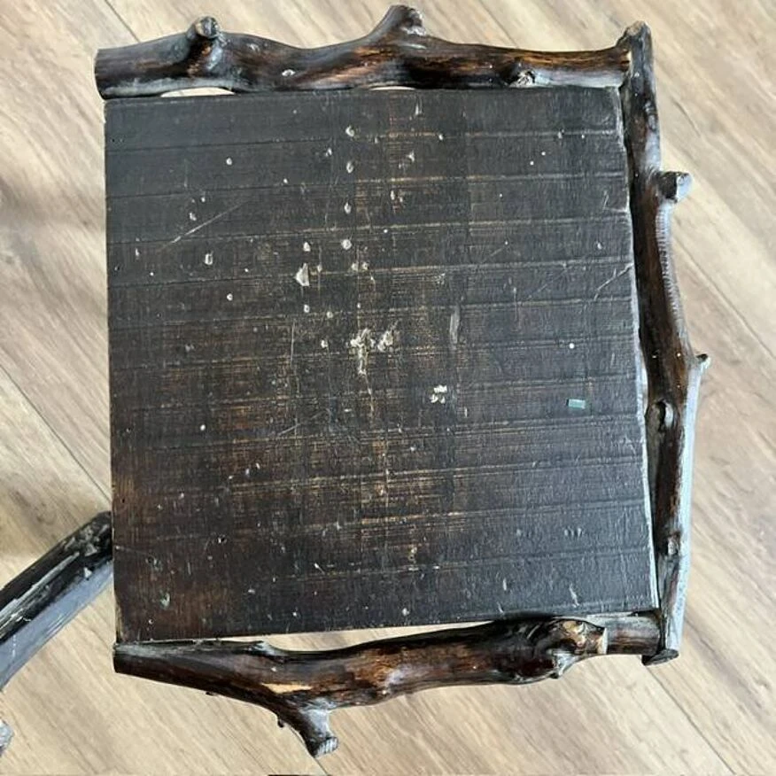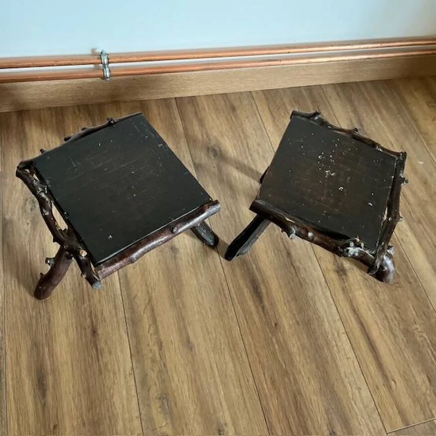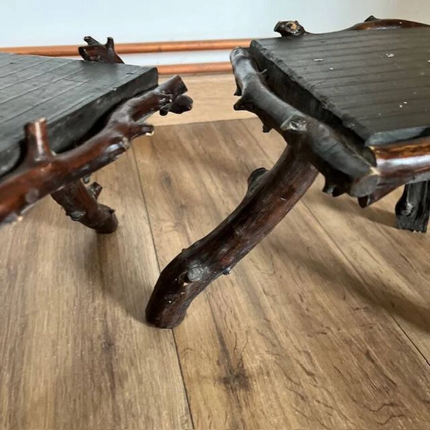 Discover the rustic elegance of these dark wood tripod stools, featuring a unique seat surrounded by sculpted branches.