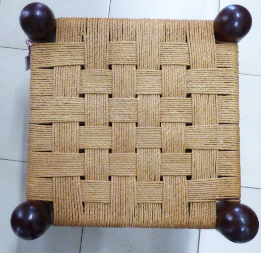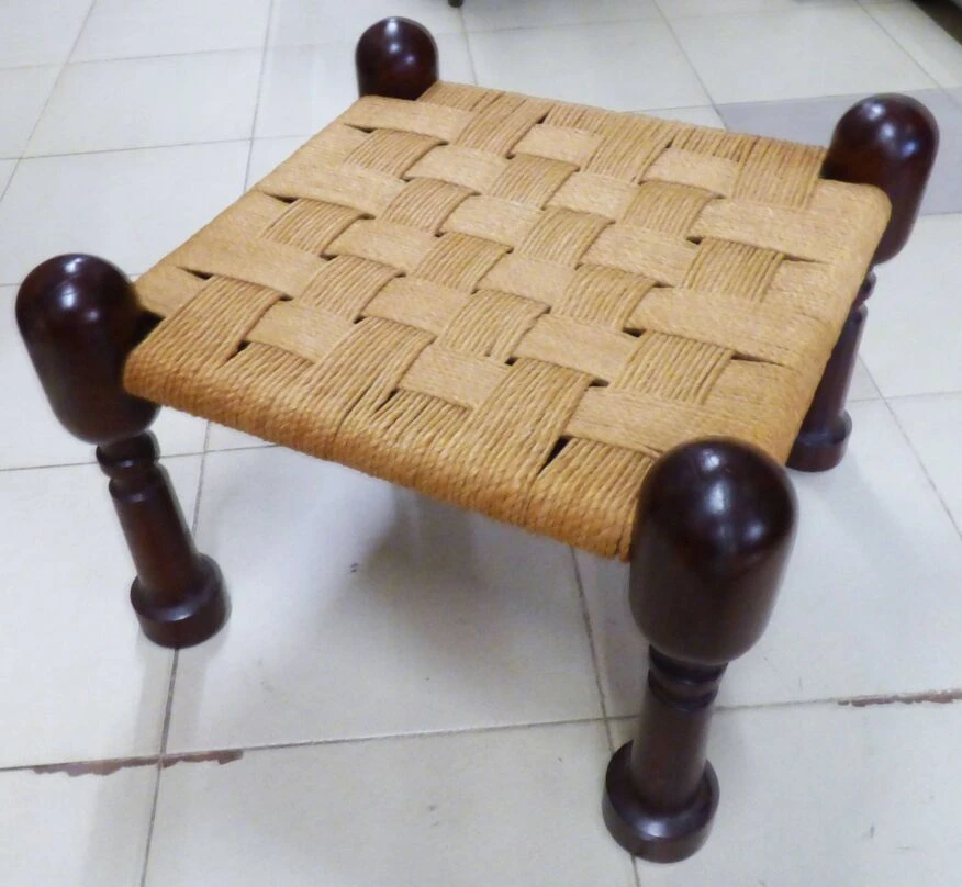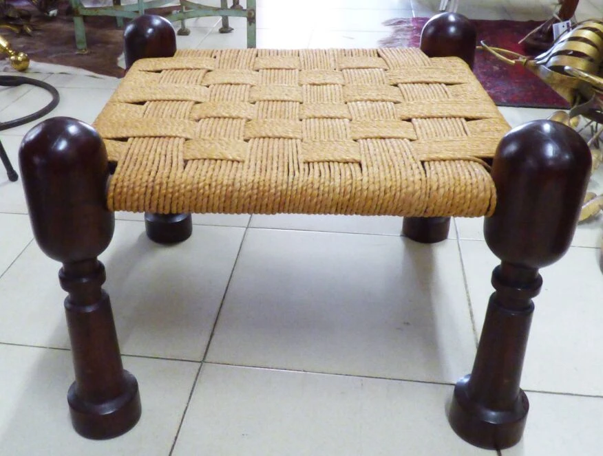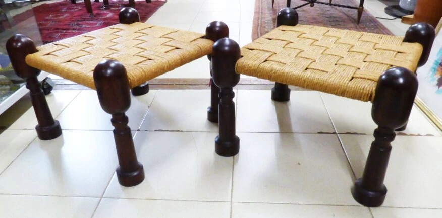 Pair of vintage anglo-indian jute and wood footrest stools.