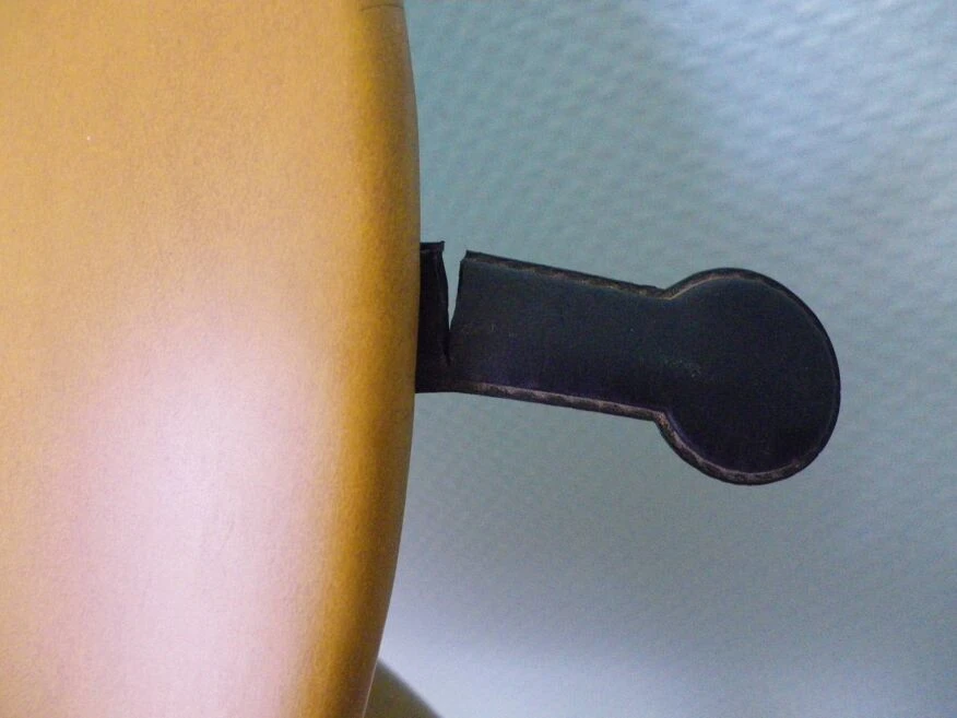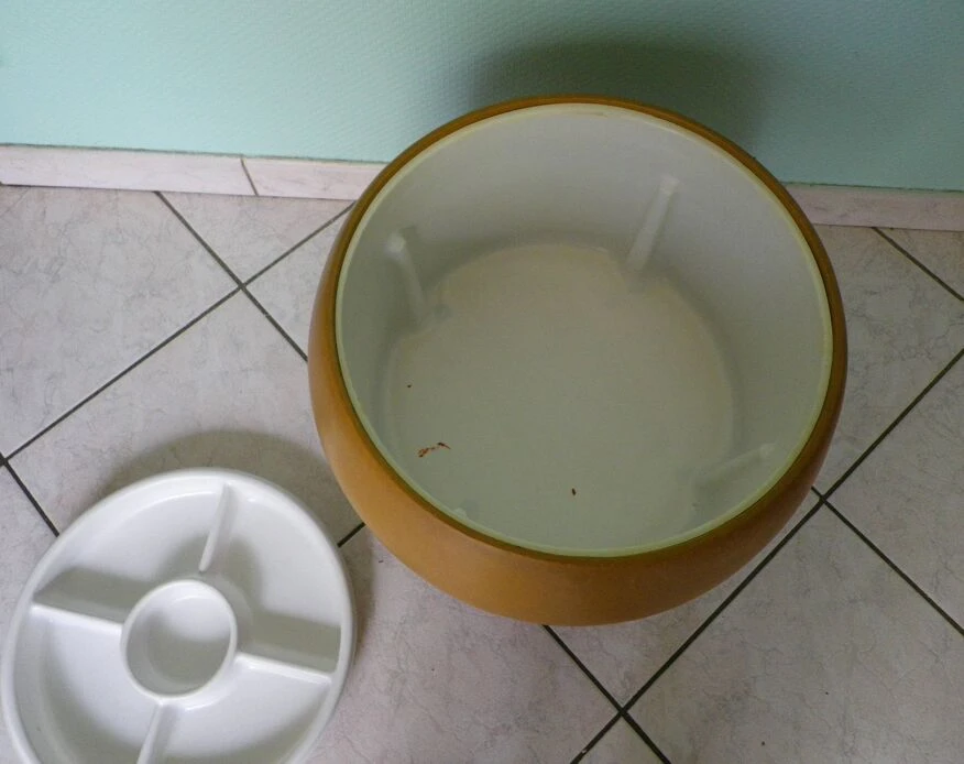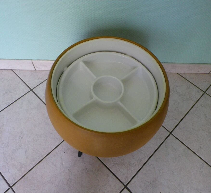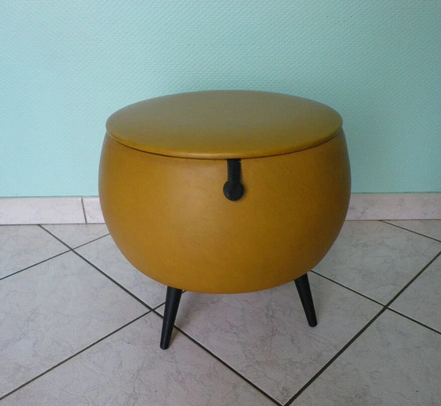 Vintage pouf combining small side or seating furniture and sewing box 1950s/1960s in light brown imitation leather the top is movable allowing storage with sewing tray with white pvc compartments 4 black wooden legs height of 40 cm, width of 45 cm, depth of 45 cm minimal traces of the past inside and small split lid strap which does not prevent the lid from being lifted.