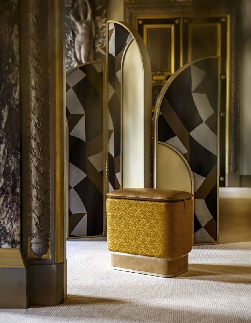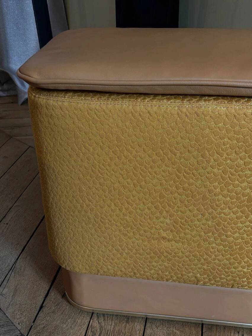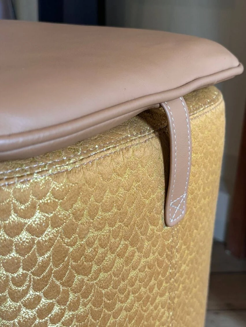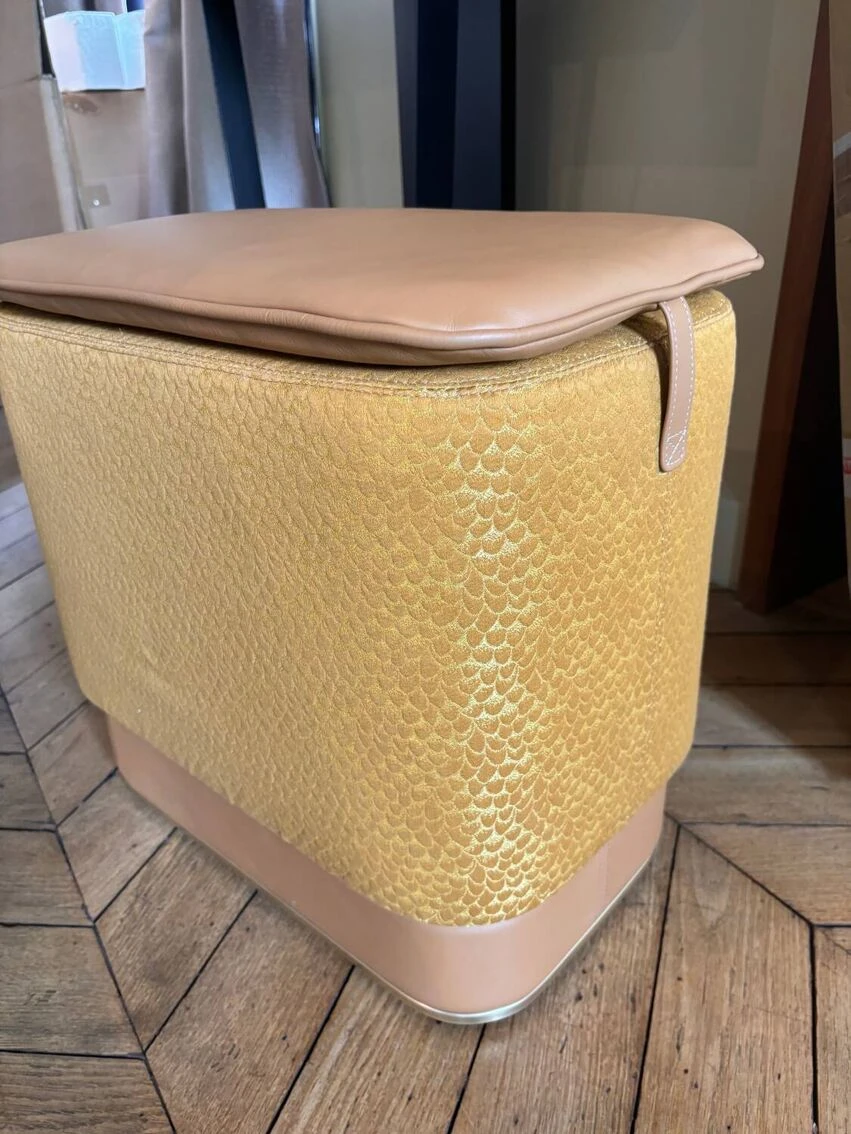 Pouf montpensier red edition design tristan auer. Layering of leather and fabric, Maison Lelievre Paris collection. The pouf is in very good condition.