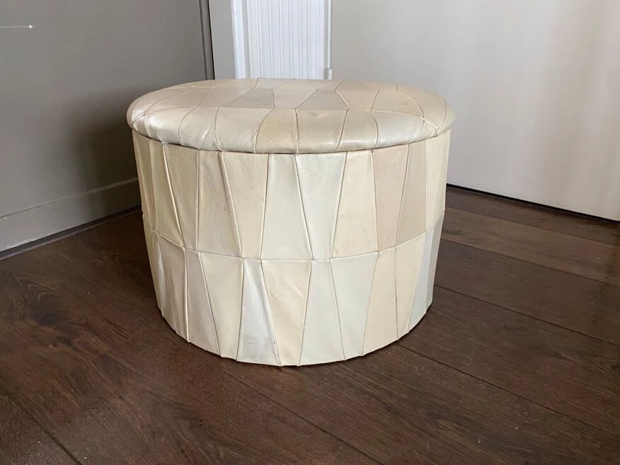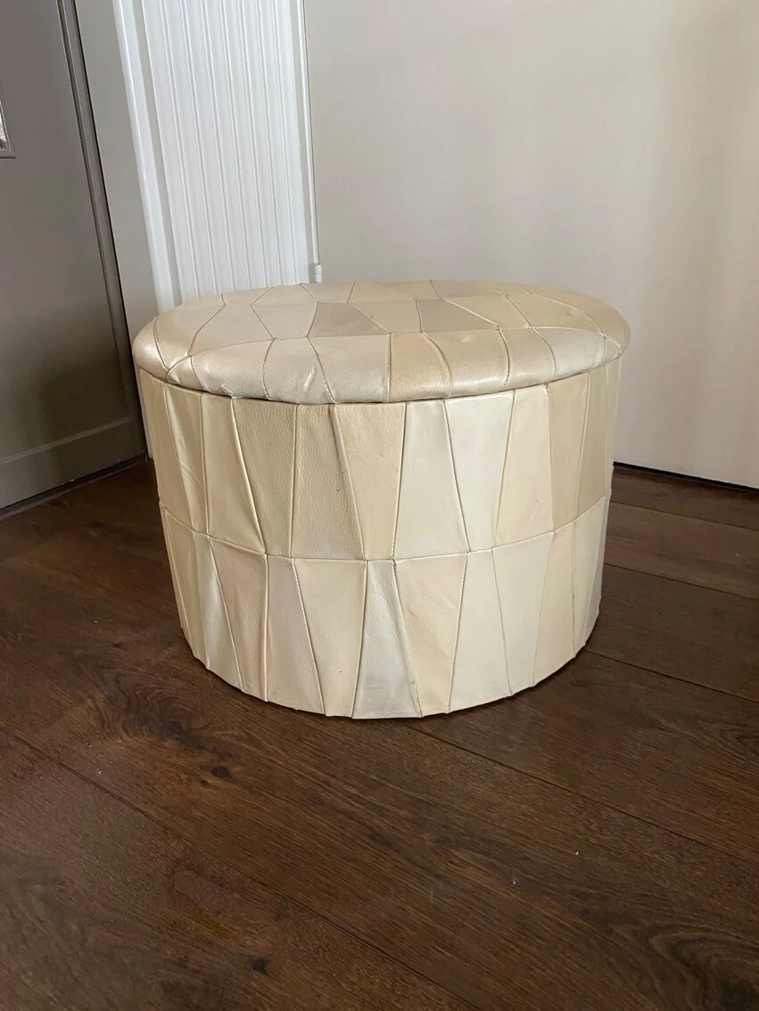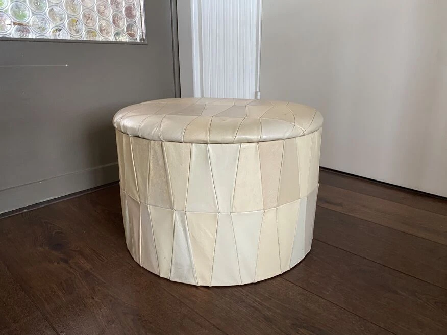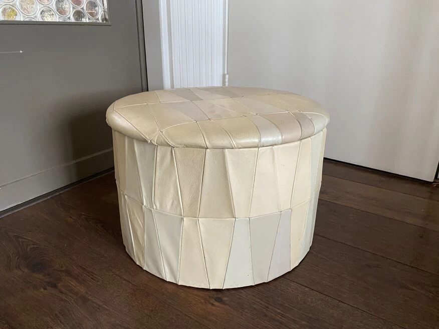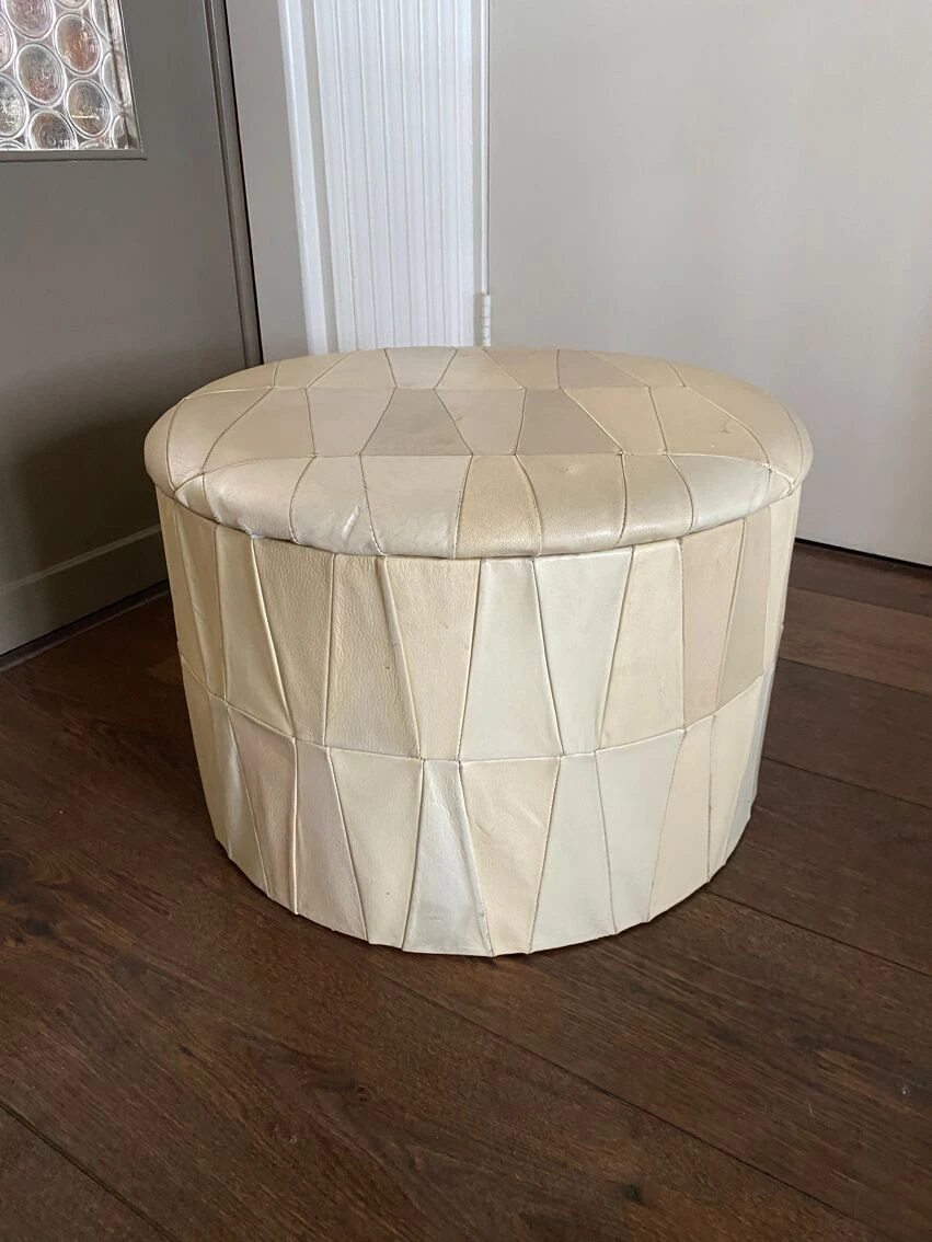 Vintage, patchwork en cuir beige du milieu du siècle sur repos-pieds à cadre en bois, pouf, pouf, rangement des années 1960.