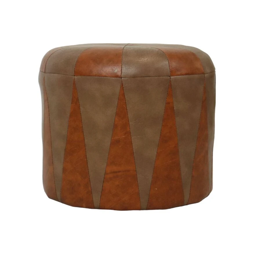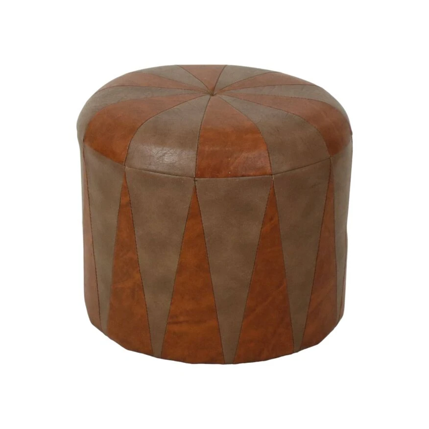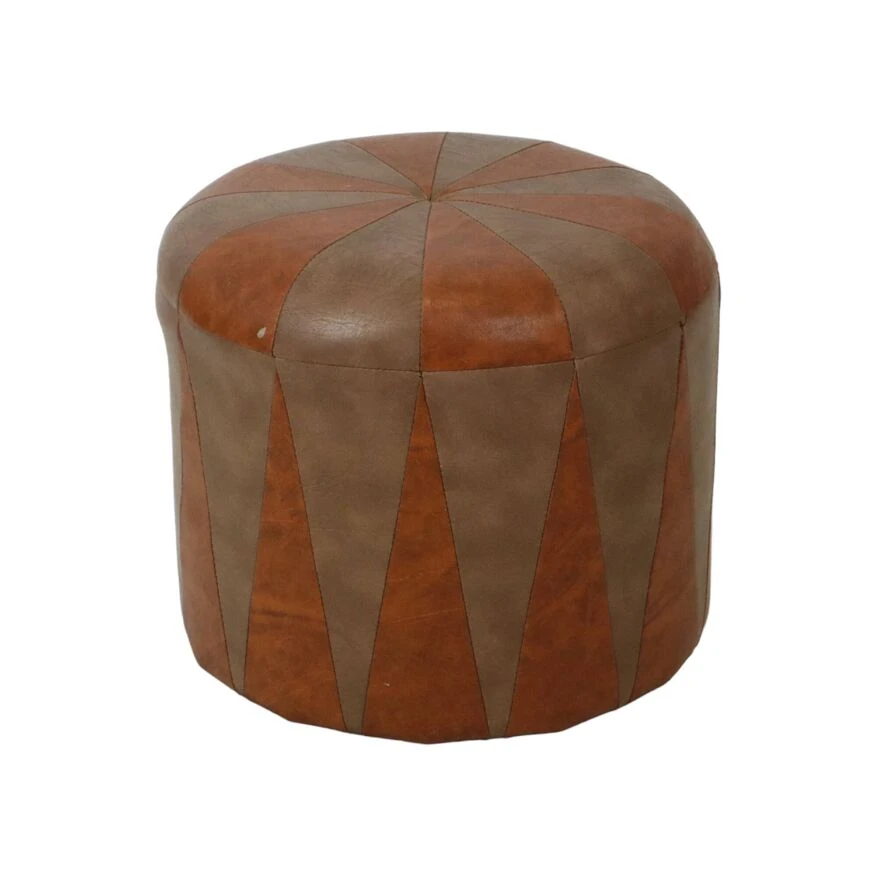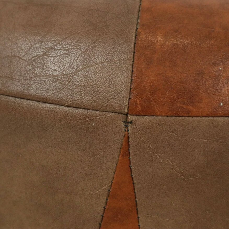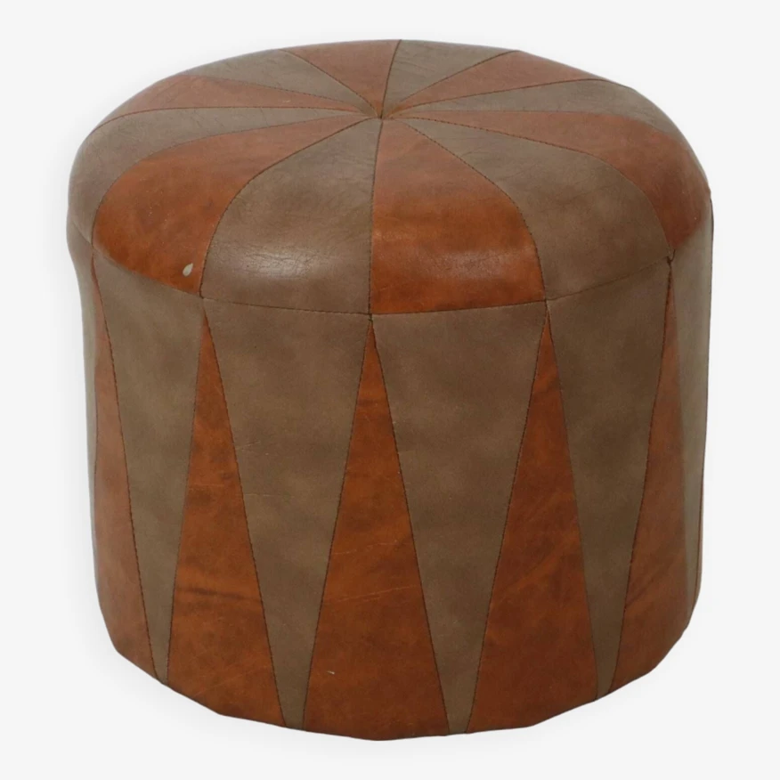 Nice round vintage ottoman in patchwork style, made from a wooden base and covered with high-quality two-tone brown imitation leather, 1960s.