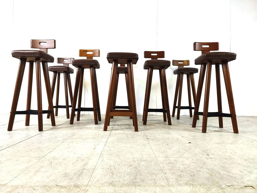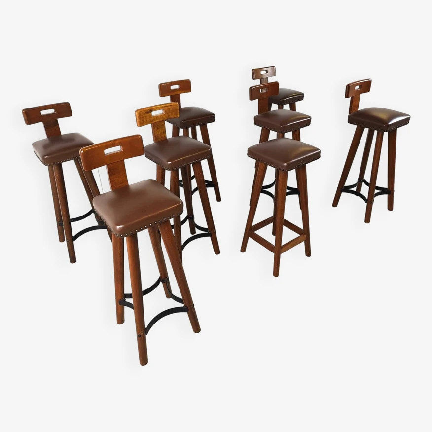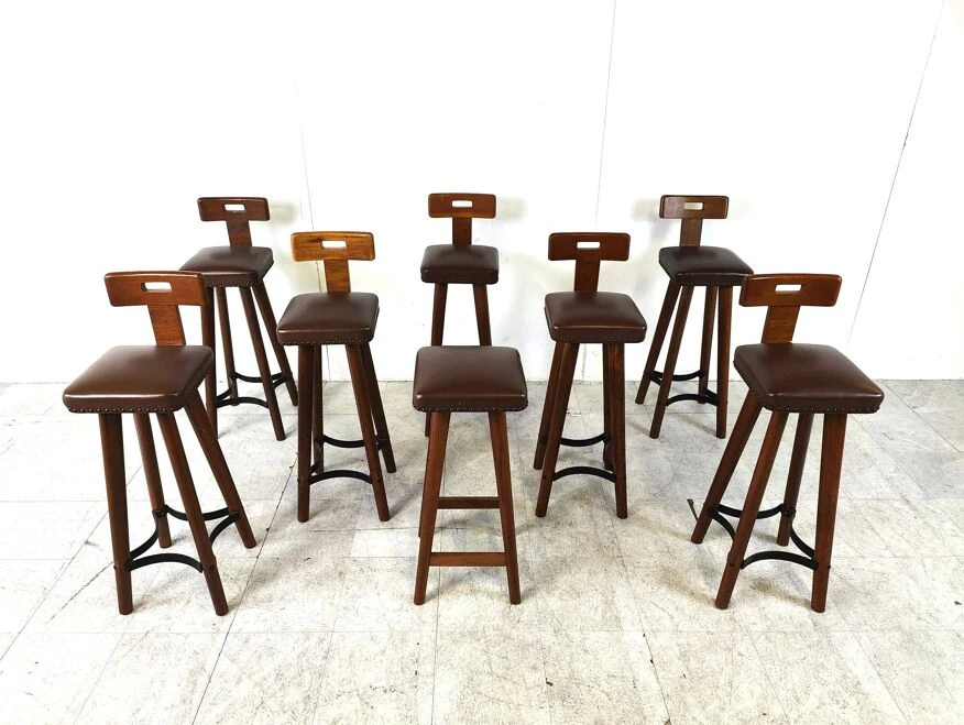 Mid century brutalist bar stools with elegant backrests and leatherette seats.