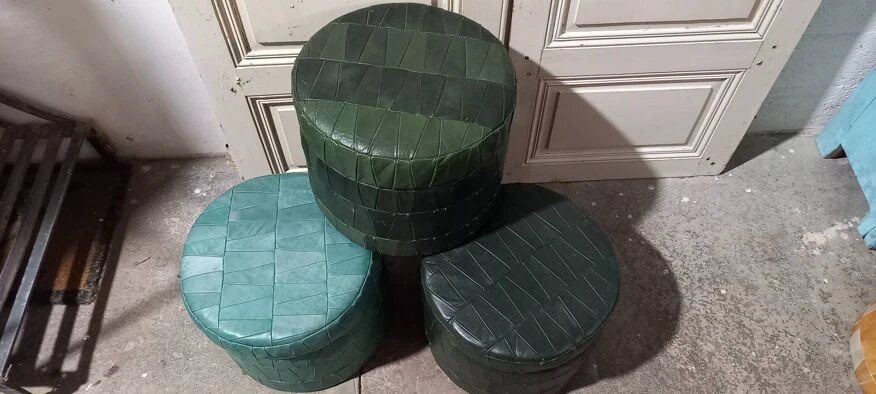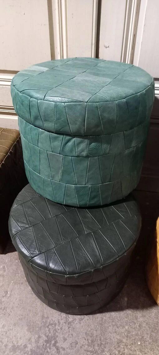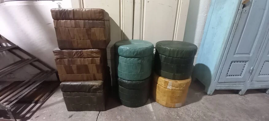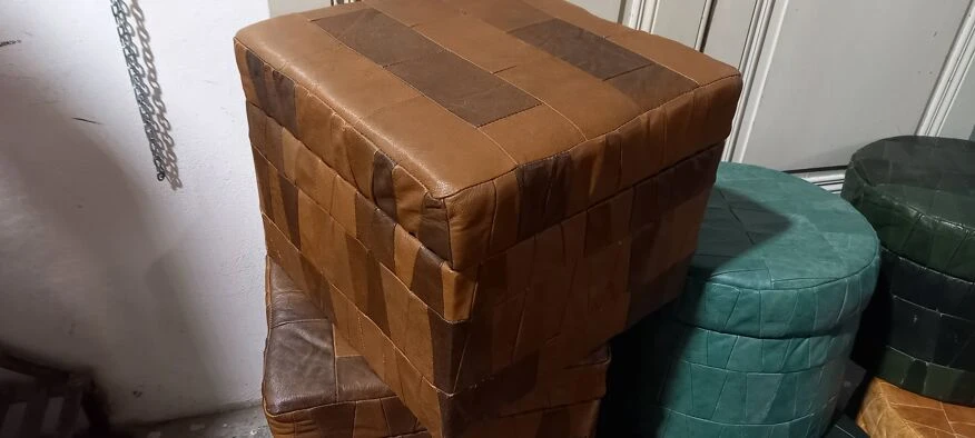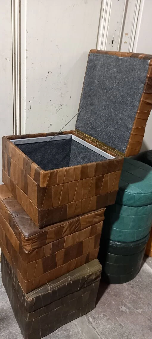 Set of 7 vintage leather storage ottomans.