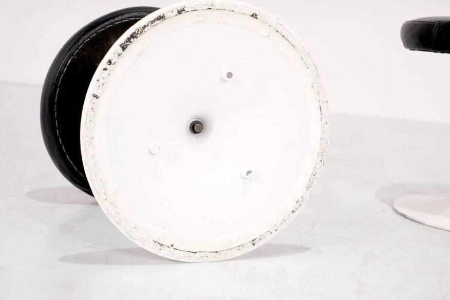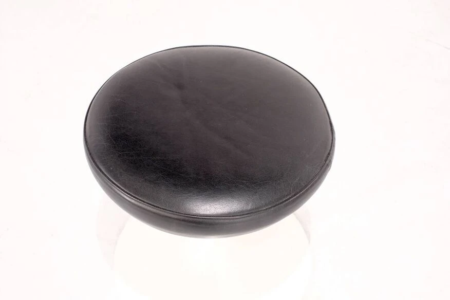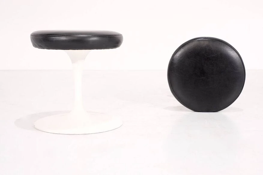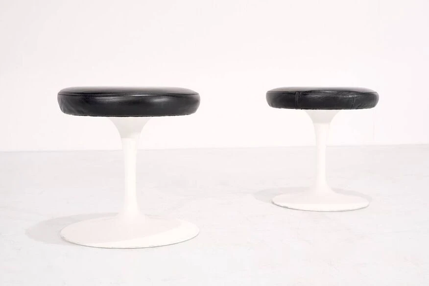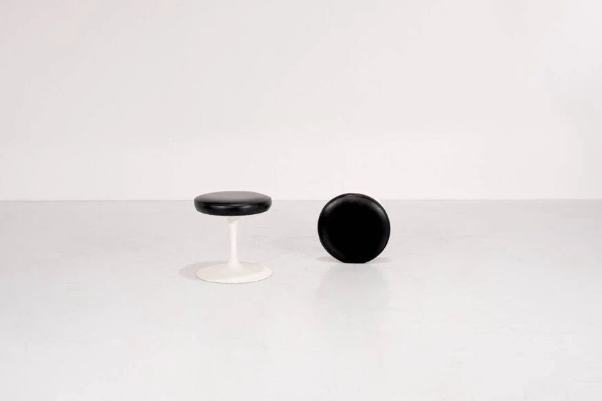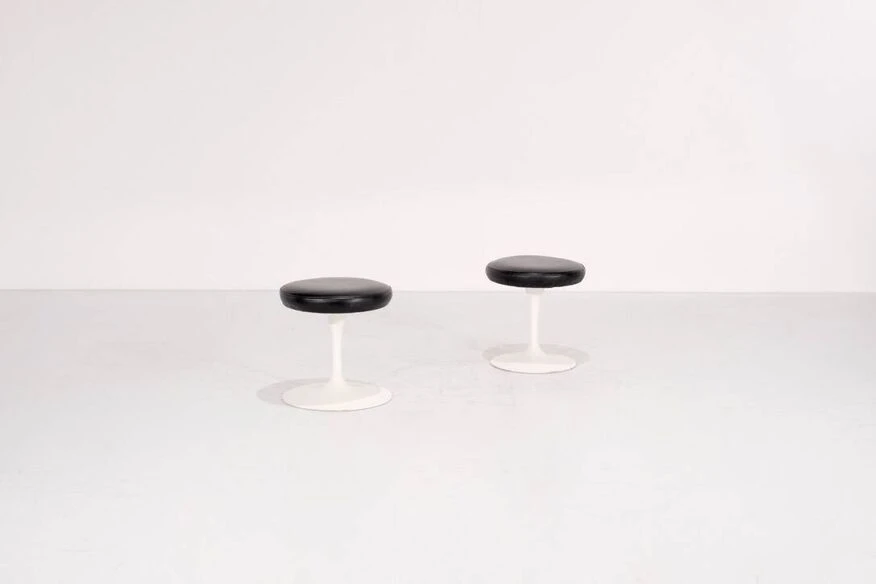 Two swivel “Tulipe” model stools in original black leather. Designed by Eero Saarinen for Knoll International, USA 1957. Designer – Eero Saarinen. Producer – Knoll International. Model – Tulip. Production period – 1970s. Dimensions – Width 38 cm x Depth 38 cm x Height 41 cm. Materials – Leather, Aluminum. Color – Black, White. Condition of the item, comments – Good condition, some scratches. Light use depending on age and use (see photos). More photos and information available upon request.