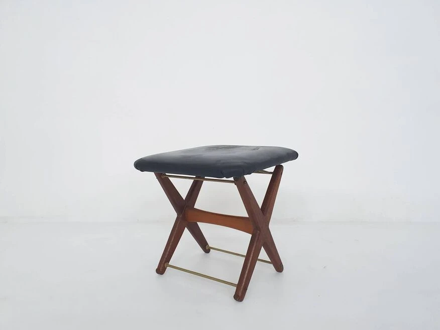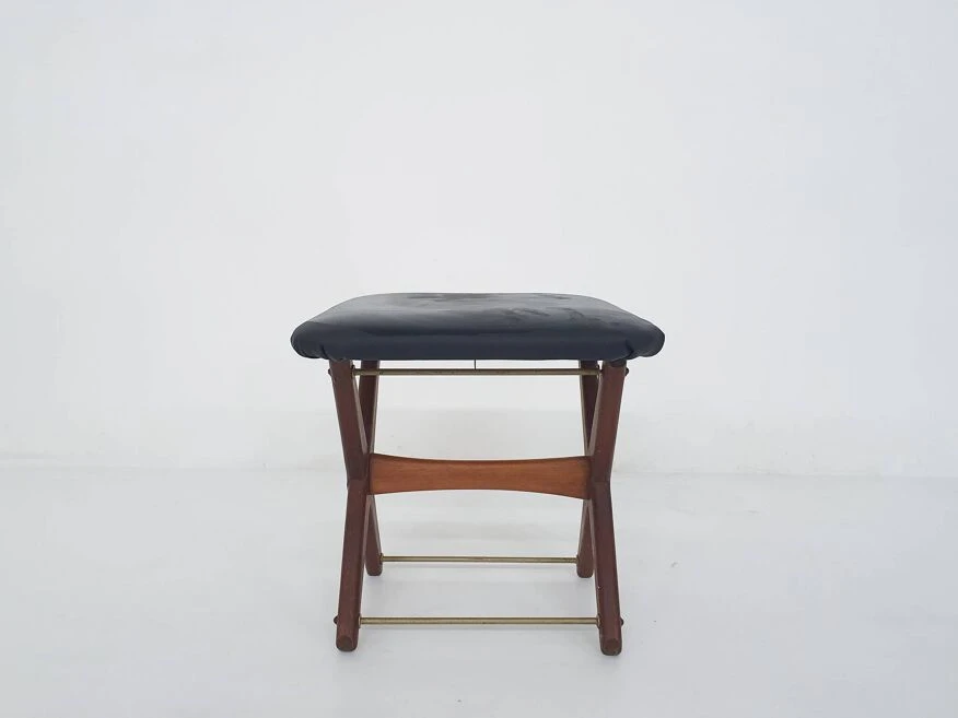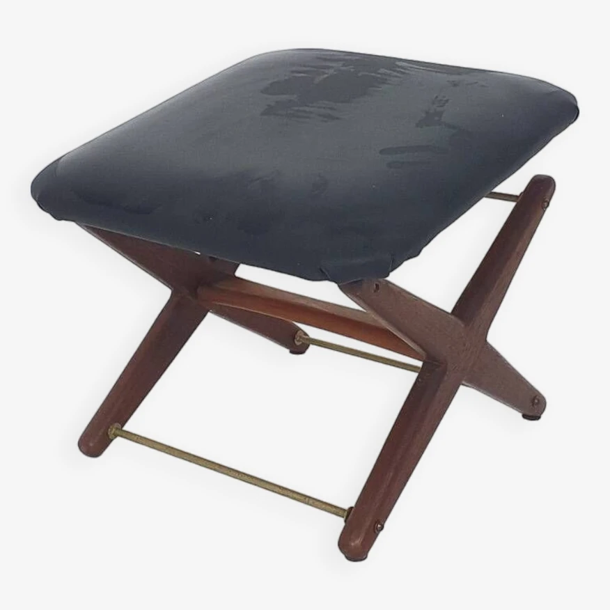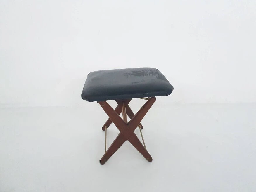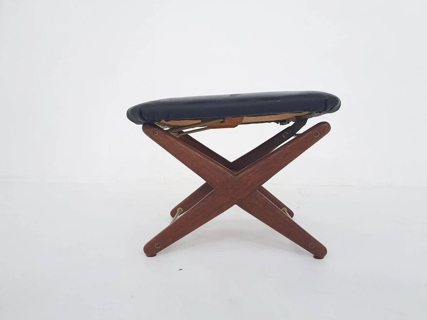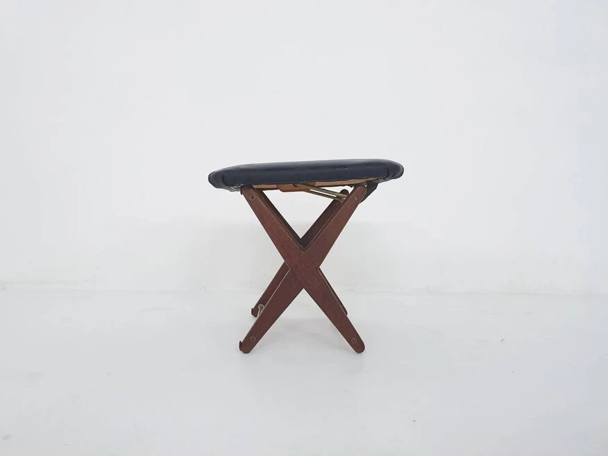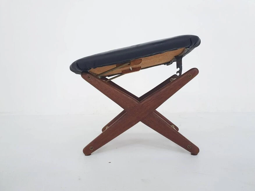 Vintage adjustable foot stool in teak and vinyl, the netherlands 1960’s teak foot stool with black fake leather upholstery.