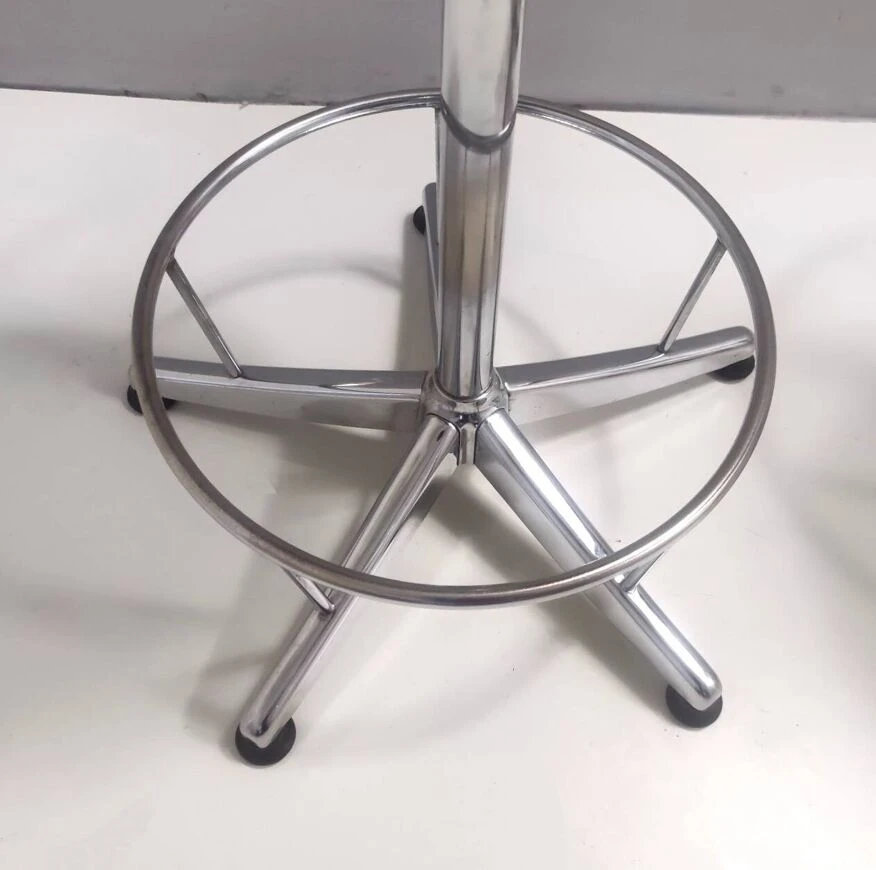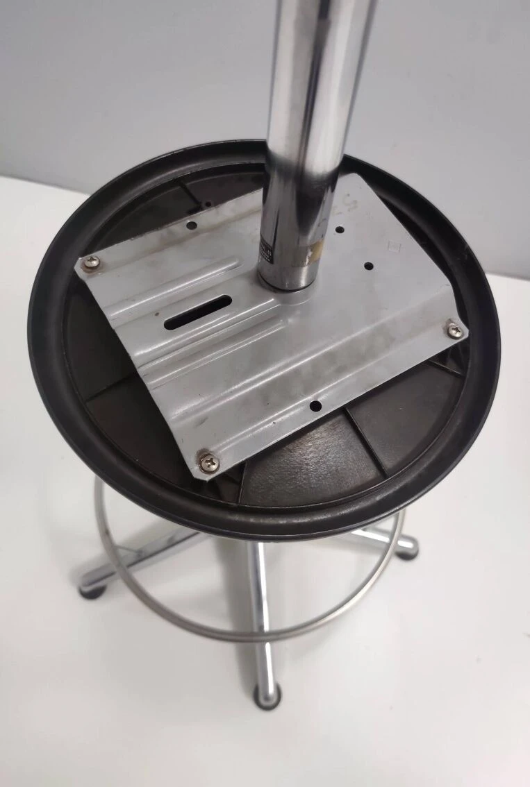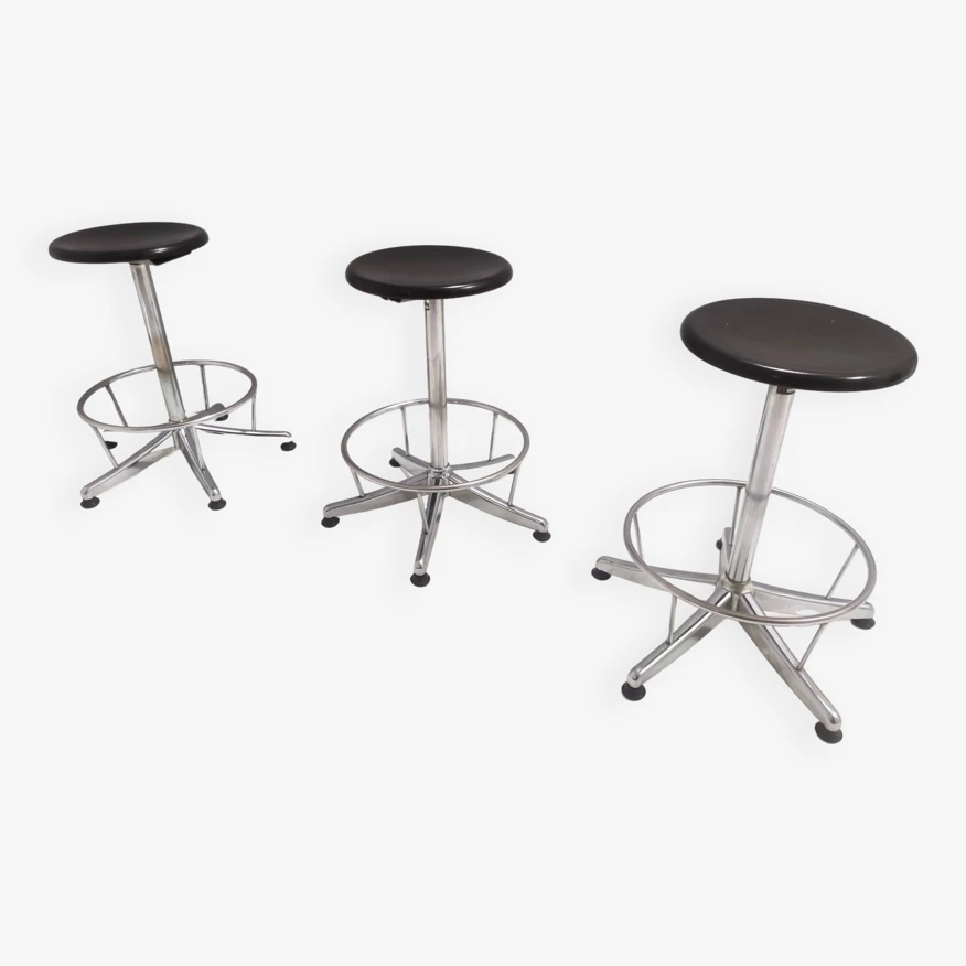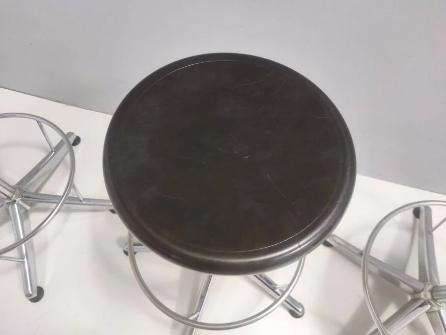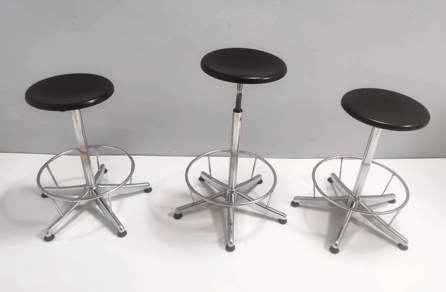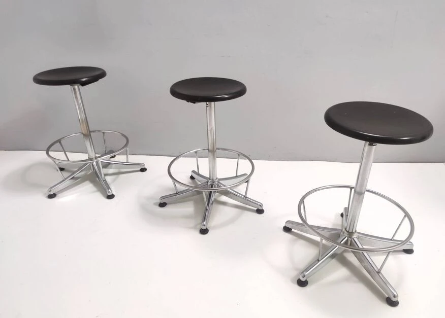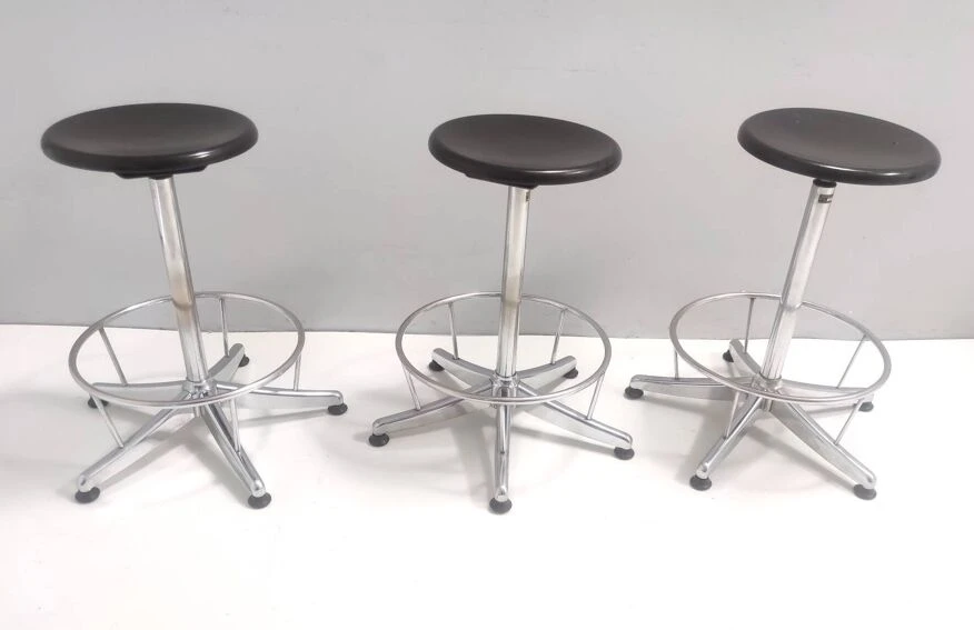 These stools feature a chrome-plated metal frame and a black plastic seat.