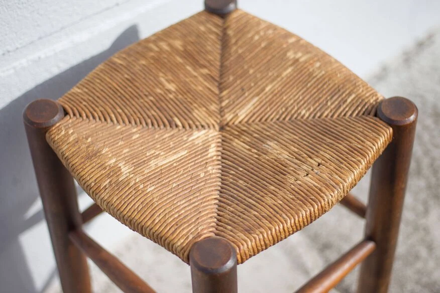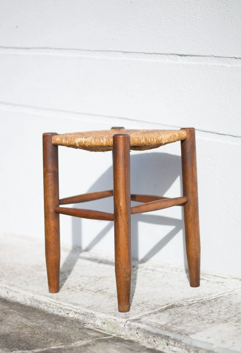 French vintage stool from the 50s, wood and straw stool, straw stool, extra seat, stool in good vintage condition (slit in the straw but remains solid, patina, wear) see photos.