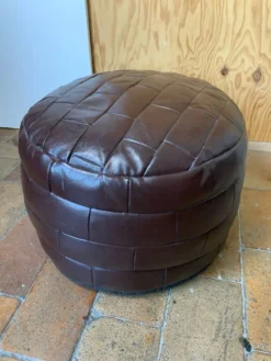 Vintage leather pouf in 2 colors cream and red, stitched in the middle with black thread.