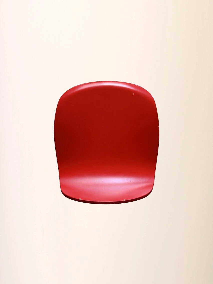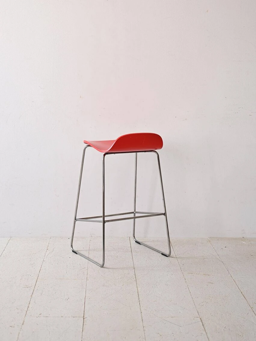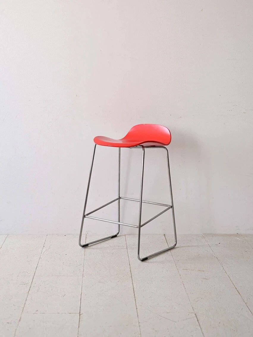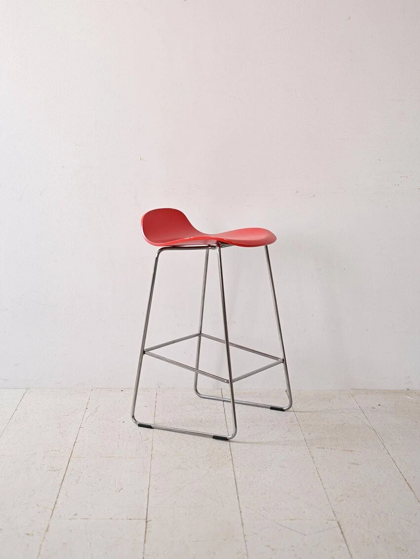 The seat, contoured for optimal comfort, is enameled in a vibrant red, creating an eye-catching contrast with the chrome-plated metal.