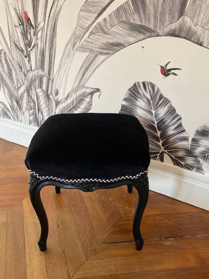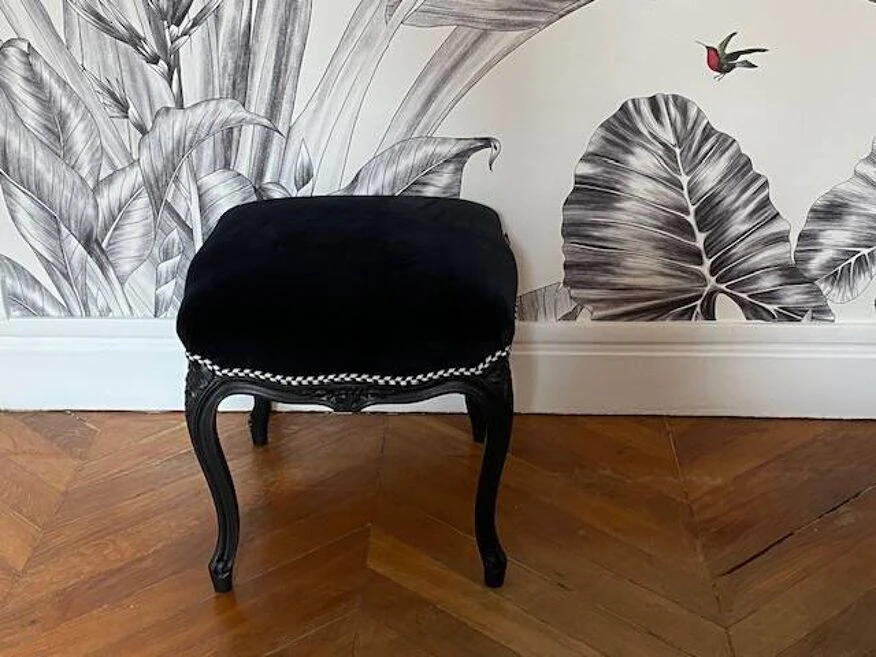 Then upholstered with this thick black velvet, 100% cotton and finally finished with a black and white braid from houlès.