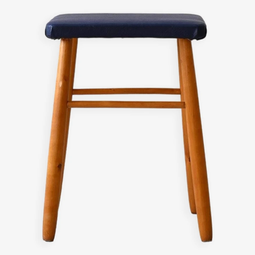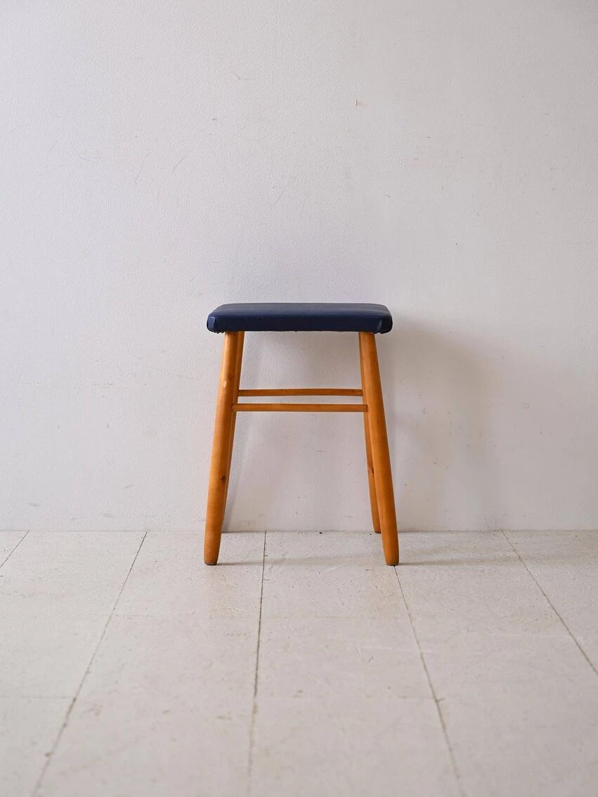 With its tapered wooden legs and dark blue leatherette upholstered seat, this stool is a combination of elegance and practicality.