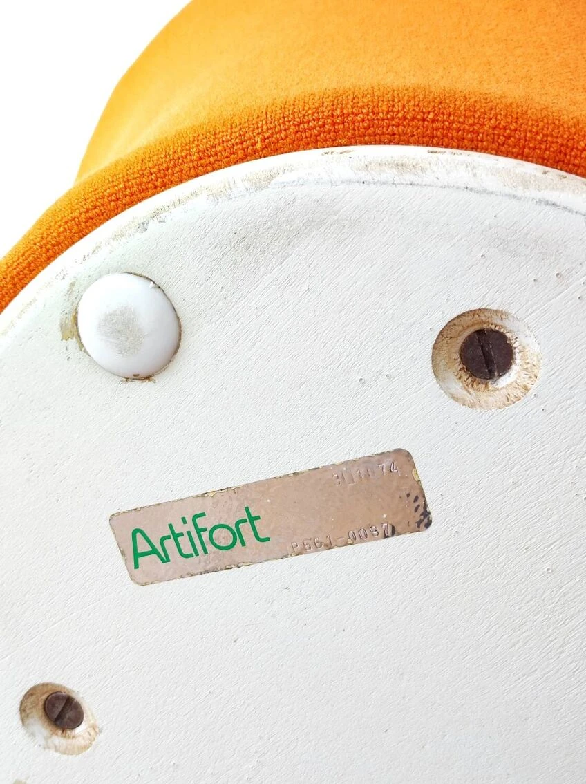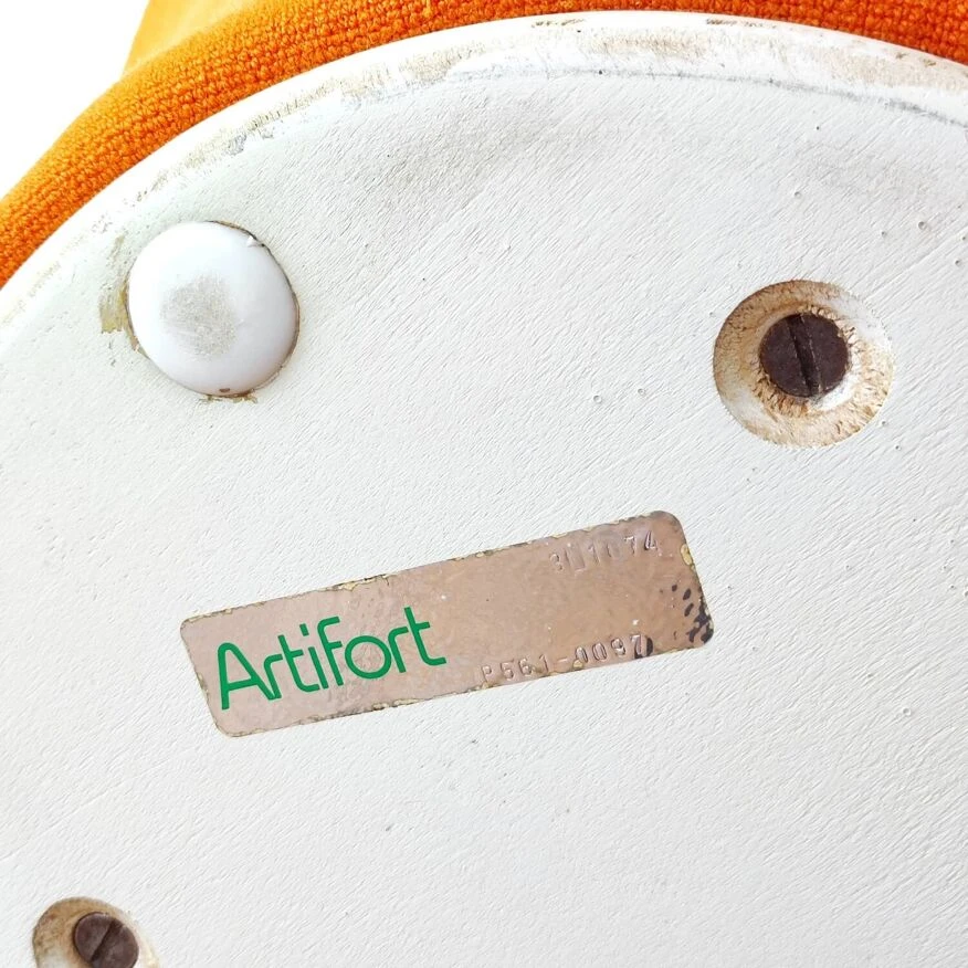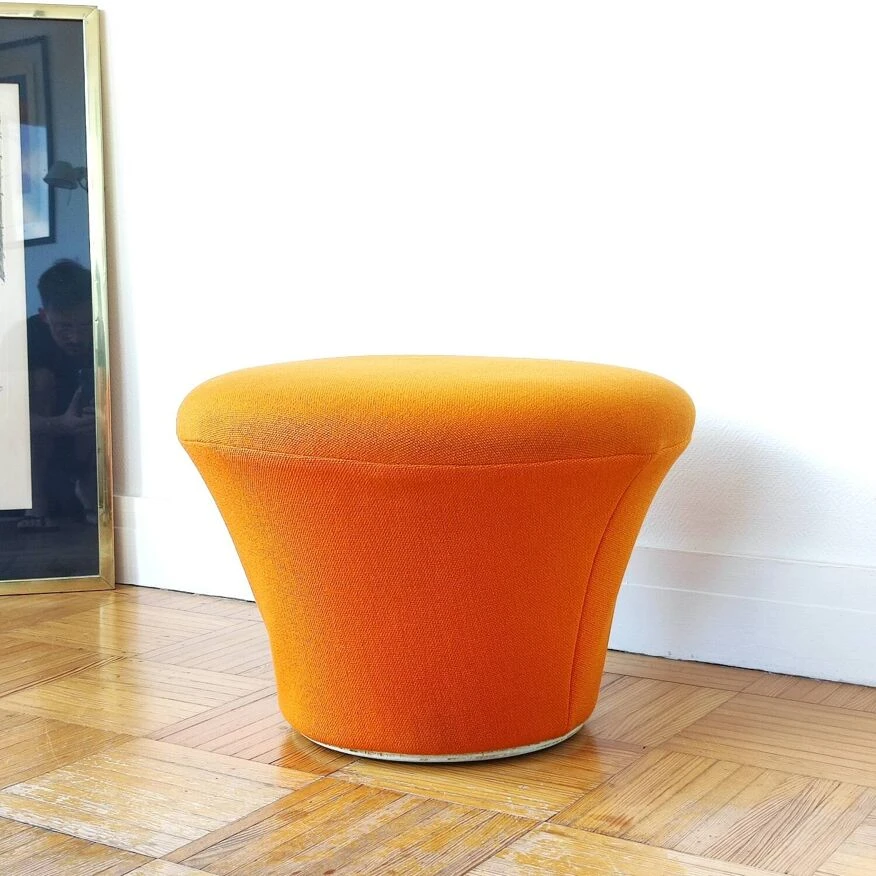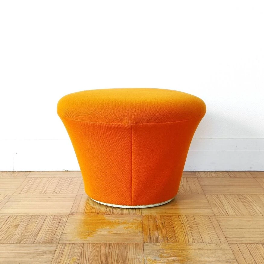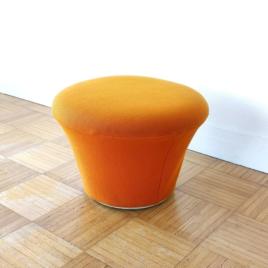 Here is a superb Mushroom pouf/footstool model P561 by the famous French designer Pierre Paulin, old Artifort edition from 1960. Inspired by nature, like many of Pierre Paulin’s productions, the P561 pouf is part of the “Mushroom” collection created in 1959. It was accompanied by the P560 armchair which is a legless armchair composed of a rigid shell, with foam padding and a jersey covering, a very recurring material in Pierre Paulin’s pieces. This same Jersey also covers the Mushroom pouf which is designed from a metal structure covered in foam, and finished with a white wooden base for the old Artifort editions like this one. The Mushroom collection is probably one of designer Pierre Paulin’s most famous collections. He himself considered it one of his most accomplished works. The pouf is in very good general condition. The moss is in good condition and has not dried out at all. The original orange Jersey fabric is also in good condition: no stains, tears or tears, it is still well stretched, has been cleaned. The original label from the publisher Artifort is present under the pouf. Dimensions: H37 x L53 x D53 Seat height: 37cm