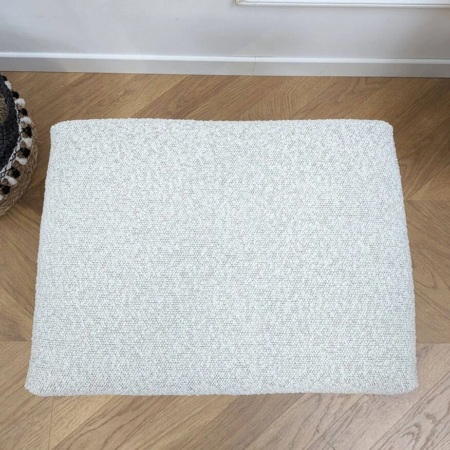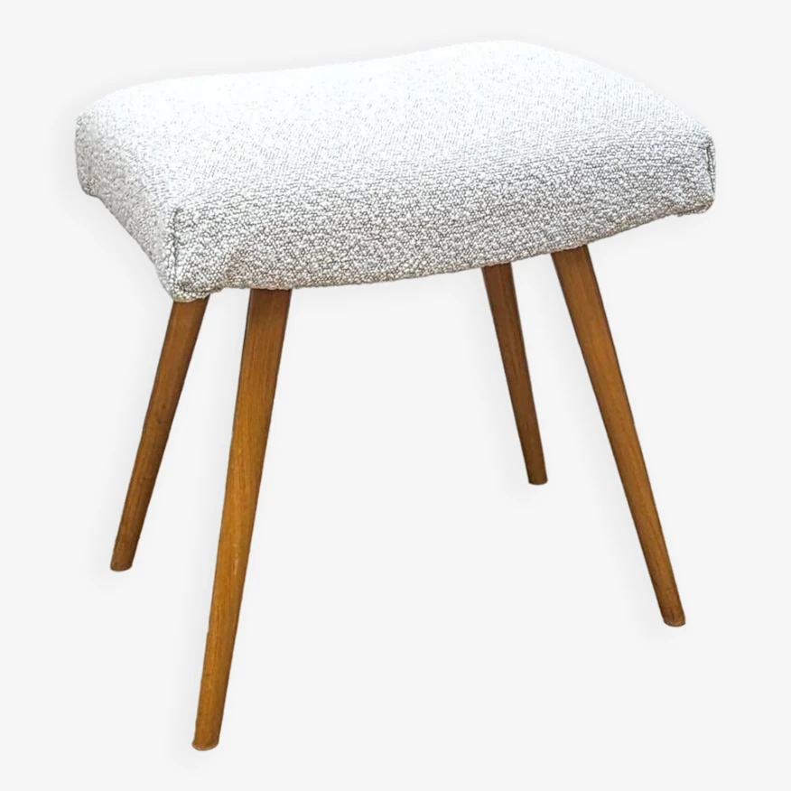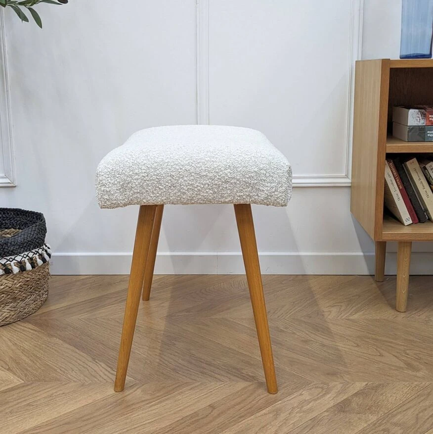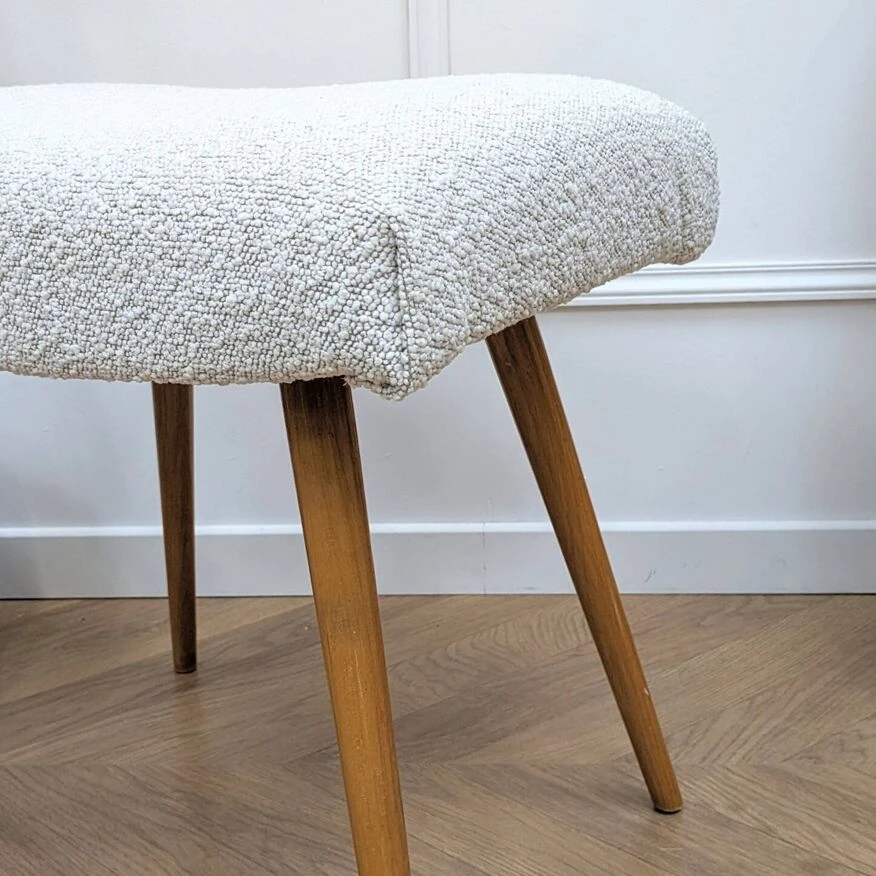 Vintage white ottoman from the 70s, found in denmark and perched on its high spindle oak legs.